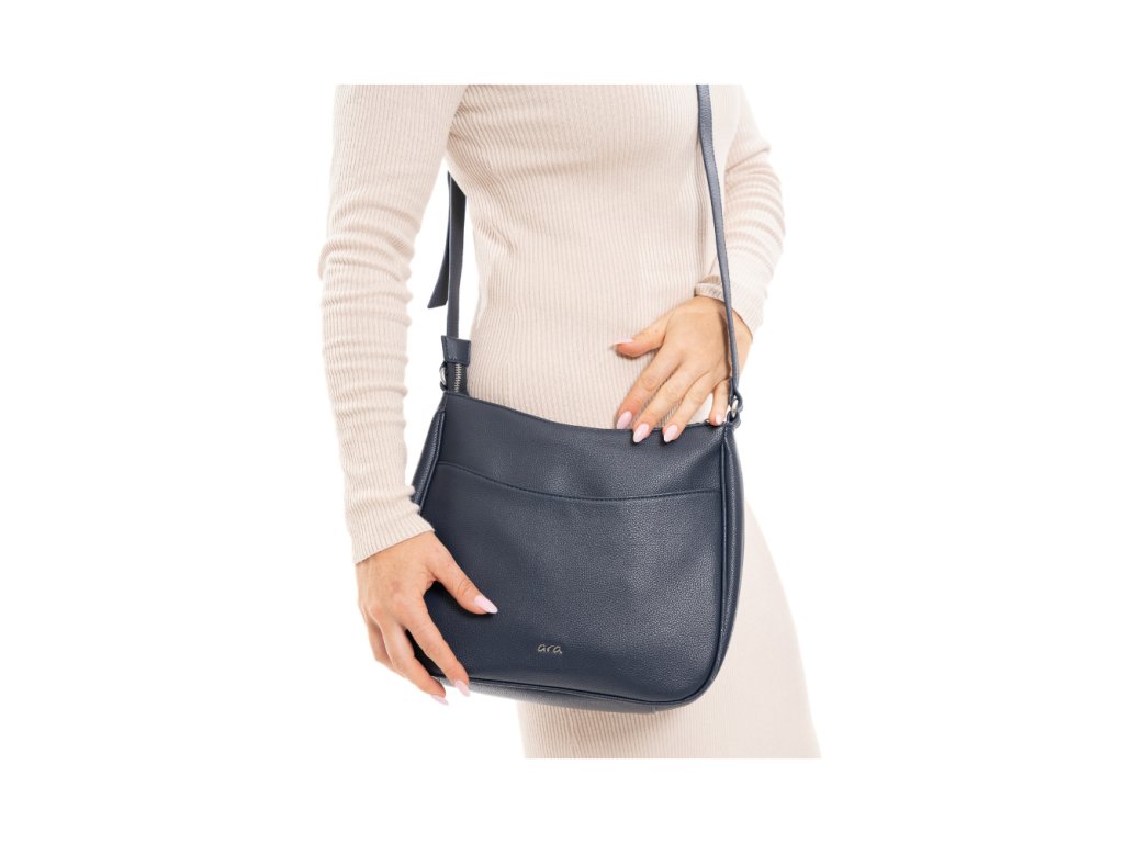 Stylová dámská kabelka Ara v tmavě modré barvě zaujme elegantním vzhledem a praktickým řešením vnitřního prostoru. Hlavní přihrádka je uzavíratelná zipem a uvnitř se nachází další zipová kapsa, dvě otevřené přihrádky a poutko s karabinkou na klíče či drobnosti.