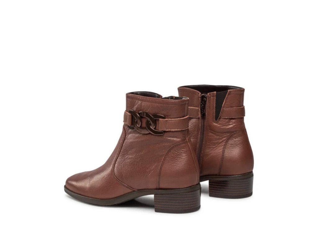 Dámské kotníkové boty Ara Graz v elegantním hnědém odstínu představují ideální spojení ženského stylu, pohodlí a kvality. Svršek z prvotřídní hladké kůže je mimořádně měkký, příjemný na dotek a přizpůsobivý tvaru chodidla. Výrazným detailem modelu je decentní pásek s kovovým prvkem, který botám dodává sofistikovaný vzhled. Uvnitř se nachází měkká textilní hřejivá podšívka, která poskytuje teplo i komfort během chladnějších dnů. Extra měkká vyjímatelná stélka s pěnovou výplní v oblasti nártu tlumí došlap a lze ji snadno vyměnit za vlastní ortopedické vložky. Inovativní technologie HighSoft® kombinuje měkký svršek, polstrovanou stélku a pružnou podešev, čímž zajišťuje měkký, lehký krok bez únavy. Praktický zip na vnitřní straně umožňuje snadné nazouvání i vyzouvání, zatímco protiskluzová podešev s 3,5 cm podpatkem poskytuje stabilitu a jistotu při chůzi. Tento model je univerzální volbou, která doplní elegantní outfit do práce i ležérní víkendový styl. Ara Graz v hnědé barvě – spojení pohodlí, funkčnosti a ženské elegance.