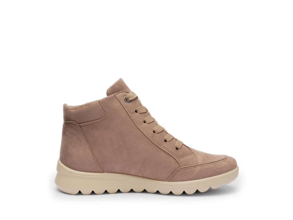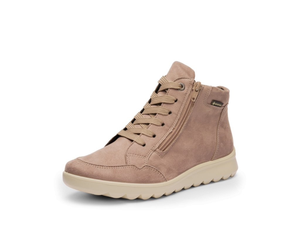 Model Ara Toronto v béžovém provedení je robustní dámská kotníková obuv navržená do náročného počasí. Svršek z měkkého materiálu je velmi pohodlný a spolu s polstrovaným lemem kolem kotníku zabraňuje nepříjemným otlakům.
