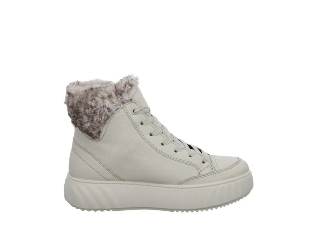 Dámské zimní kotníkové boty Monaco v krémové barvě spojují moderní styl, funkčnost a komfort. Svršek z hladké kůže s přirozenou strukturou je doplněn kotníkovým lemem z hebké kožešinky, který podtrhuje zimní charakter boty. Střih H s kulatou špičkou je vhodný i pro širší typ chodidla. Praktické šněrování doplňuje funkční zip na vnější straně pro snadné obutí. Uvnitř se nachází teplá podšívka z umělého beránku, zatímco kotníková část je vystlaná hebkou kožešinkou. Extra měkká vyjímatelná stélka s textilním potahem je vybavena vystouplým srdíčkem, podporou podélné klenby a patní částí, čímž poskytuje maximální komfort. Vodoodpudivá membrána Gore-Tex® působí jako izolant, chrání před chladem a nepropustí vlhkost, takže vaše nohy zůstanou v teple a suchu i během nepříznivého počasí. Technologie HighSoft® kombinuje měkký svršek, polstrovanou stélku a flexibilní podešev pro výjimečně pohodlnou chůzi. Vyšší syntetická podešev s platformou 3,5 cm a podpatkem 4 cm poskytuje stabilitu a jistotu kroku. Výška kotníku cca 12 cm (bez podešve) zajišťuje dostatečnou oporu a ochranu. Tento model je perfektní volbou pro ženy, které hledají zimní obuv v jemném krémovém odstínu s kombinací elegance, tepla a funkčnosti.