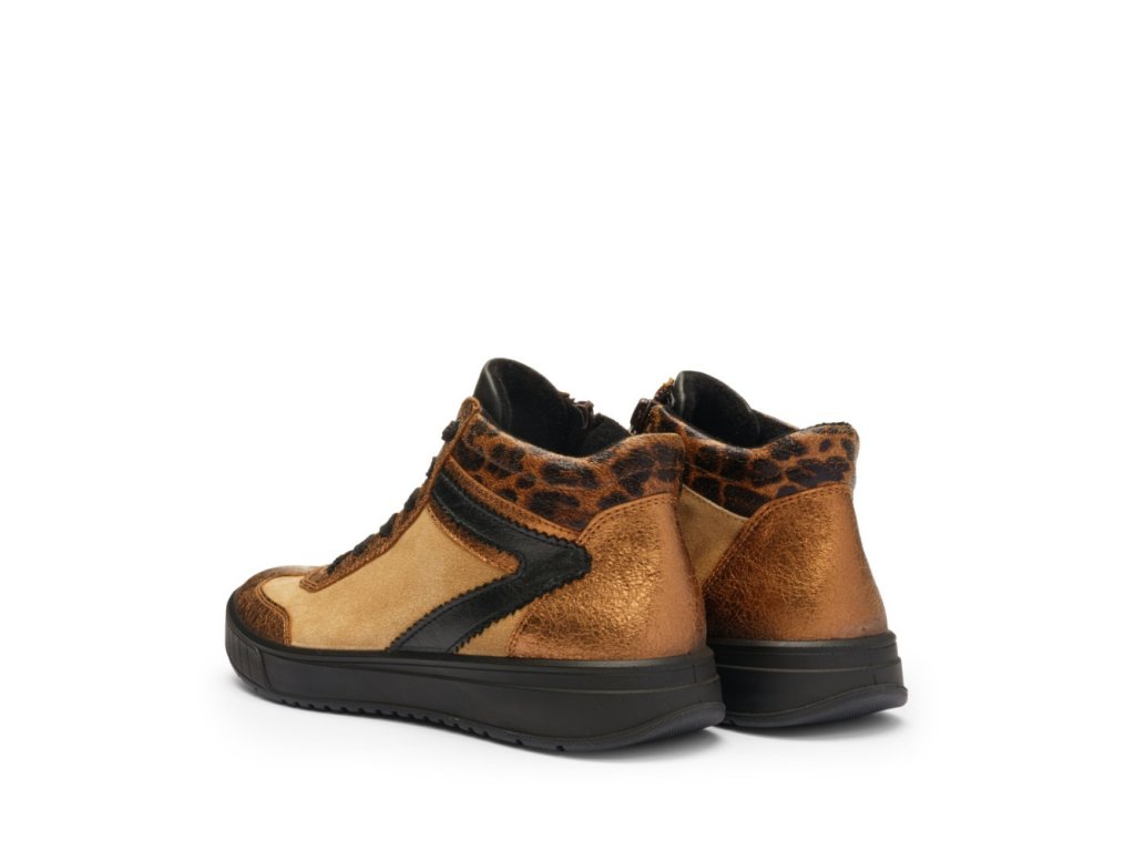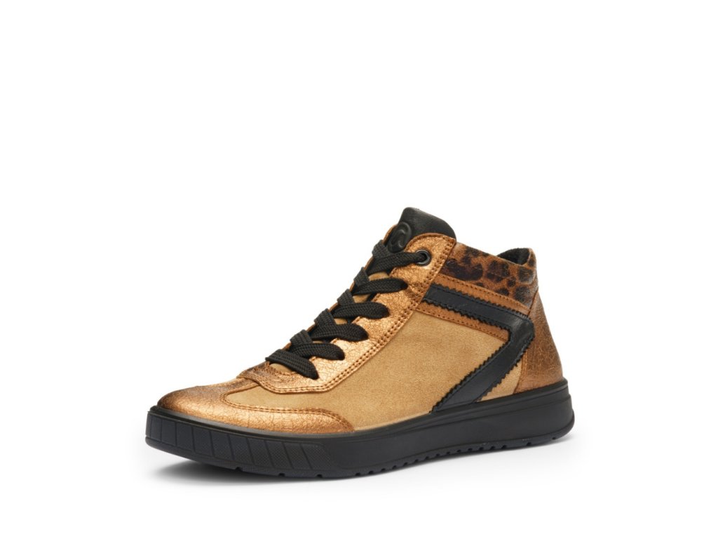 Stylové dámské sneakers Ara v moderním hightop střihu spojují nadčasový design a dokonalý komfort. Svršek z kvalitní měkké kůže v kombinaci se zlatavě měděným odstínem a kontrastními detaily působí luxusně a atraktivně. Kombinace šněrování a bočního zipu zajišťuje snadné obouvání i perfektní přizpůsobení noze, zatímco polstrovaný kotník chrání před otlaky a zvyšuje pohodlí.