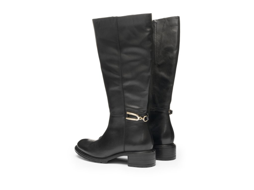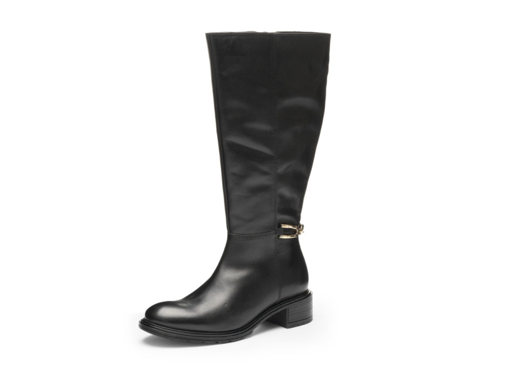 Kvalitní a mimořádně pohodlné dámské kozačky od značky Ara představují perfektní volbu pro ženy s plnějším lýtkem. Elegantní svršek z hladké černé kůže doplňuje kulatá špička a decentní ozdobná aplikace ve zlaté barvě na vnější straně kotníku.