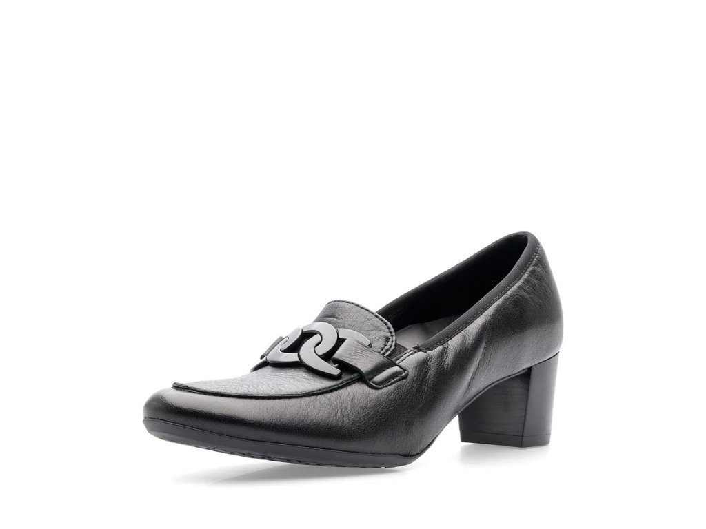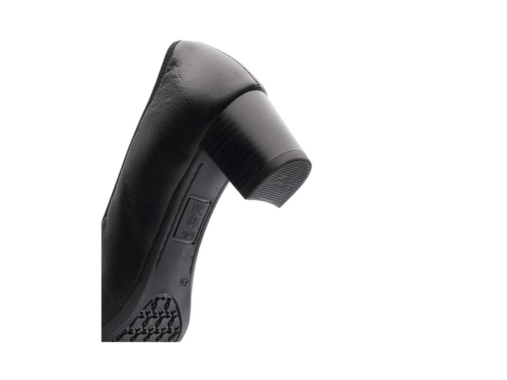 Dámské lodičky Jive v klasické černé barvě spojují nadčasovou eleganci a výjimečné pohodlí. Svršek z jemně strukturované kůže zdobí decentní šev na špičce a kovová aplikace v černé barvě, které podtrhují sofistikovaný vzhled. Kulatá špička, pružný lem a všité gumičky na nártu zajišťují snadné obutí i optimální padnutí na nohu. Uvnitř se nachází poddajná kožená podšívka a extra měkká vyjímatelná vložka s podporou podélné klenby, patním absorbérem a ortopedickým srdíčkem, doplněná o zabroušený vnitřní opatek pro pevné usazení paty. Inovativní technologie HighSoft® kombinuje měkký svršek, polstrovanou stélku a flexibilní podešev pro maximální pohodlí při chůzi. Flexibilní latexová podešev s hrubším dezénem a širokým podpatkem o výšce 4,8 cm poskytuje stabilitu i komfort. Lodičky jsou vyrobeny lepeným způsobem, který jim dodává lehkost a dlouhou životnost. Tento model je ideální volbou pro ženy, které hledají spolehlivé, elegantní a pohodlné lodičky pro každodenní nošení i speciální příležitosti.