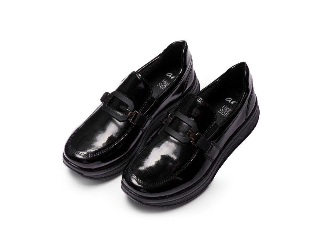 Elegantní mokasíny z černé lakované kůže nabízejí lehkost, moderní design a výjimečný komfort. Výrazným detailem je ozdobná spona na nártu, která modelu dodává sofistikovaný vzhled. Měkký svršek a celkové polstrování chrání chodidla před otlaky, zatímco technologie HighSoft kombinuje měkký materiál s komfortní stélkou pro pohodlný došlap i při celodenním nošení.