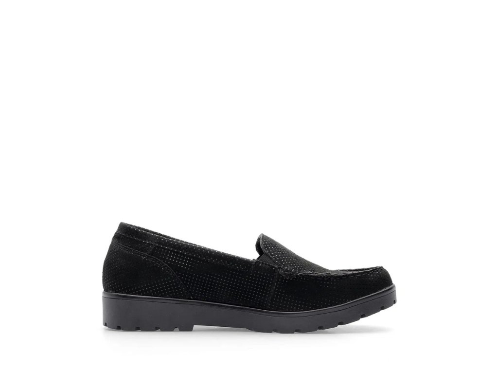 Dámské mokasíny Ara z jemné broušené kůže v univerzální černé barvě představují perfektní spojení komfortu, stylu a kvality. Jejich poddajný semišový svršek se přirozeně přizpůsobí tvaru chodidla a dodává botě elegantní, decentní vzhled. Po obou stranách nártu jsou všité nenápadné pruženky, které usnadní nazouvání a zároveň zajistí optimální přilnavost k noze.