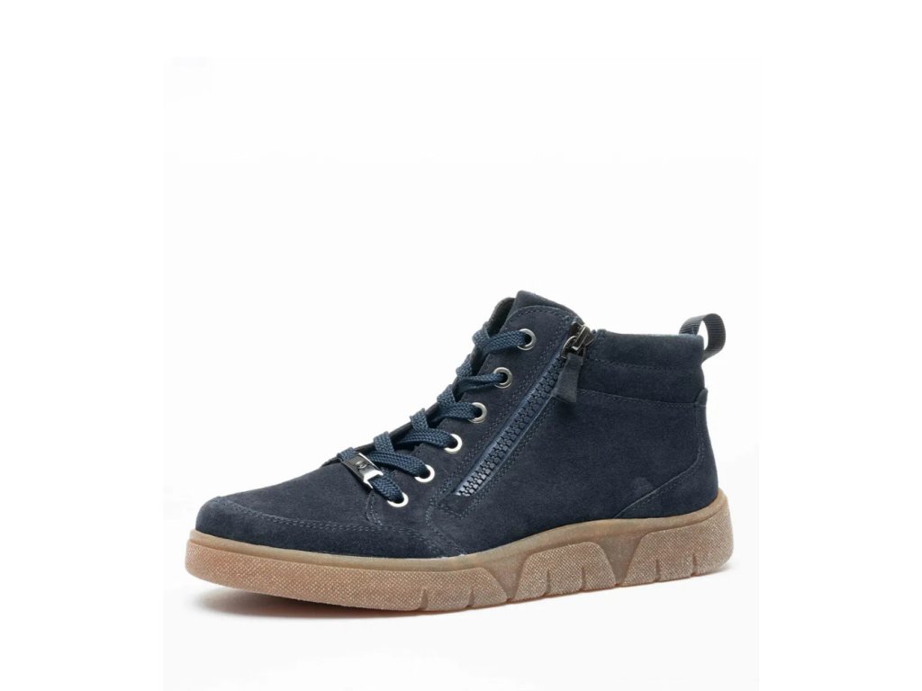 Dámské hightop tenisky Ara Rom-Sport v modré barvě spojují nadčasový design a moderní komfort. Jejich měkký semišový svršek působí elegantně a zároveň se přizpůsobí noze, zatímco polstrování v oblasti kotníku poskytuje pohodlný a jistý pocit při nošení.