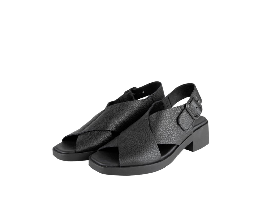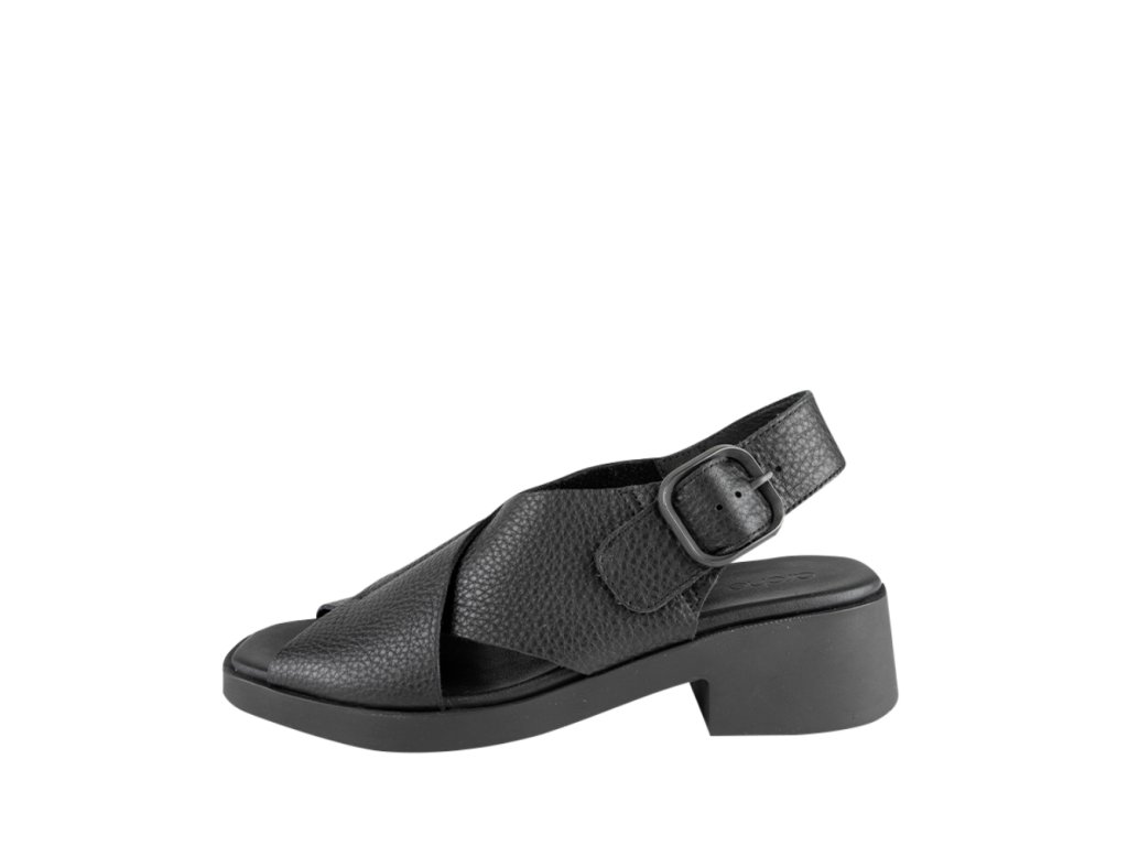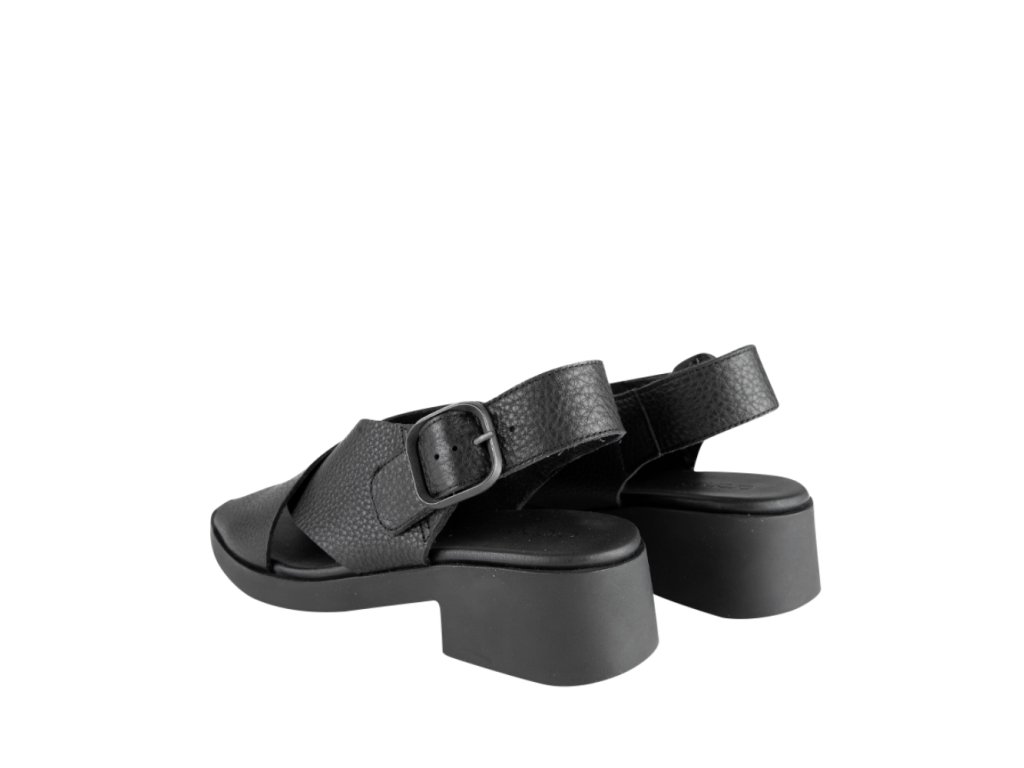 Sandály s překříženými pásky na nártu a otevřenou špičkou. Vyrobeny z lícové hovězí kůže s jemně saténovým leskem v černé barvě. Podešev z černé gumy s nízkým podpatkem zajišťuje pohodlný krok. Vnitřní stélka je z hladké černé kůže. Výrazným prvkem je nastavitelný pásek s širokou sponou, který se přizpůsobí každé noze.