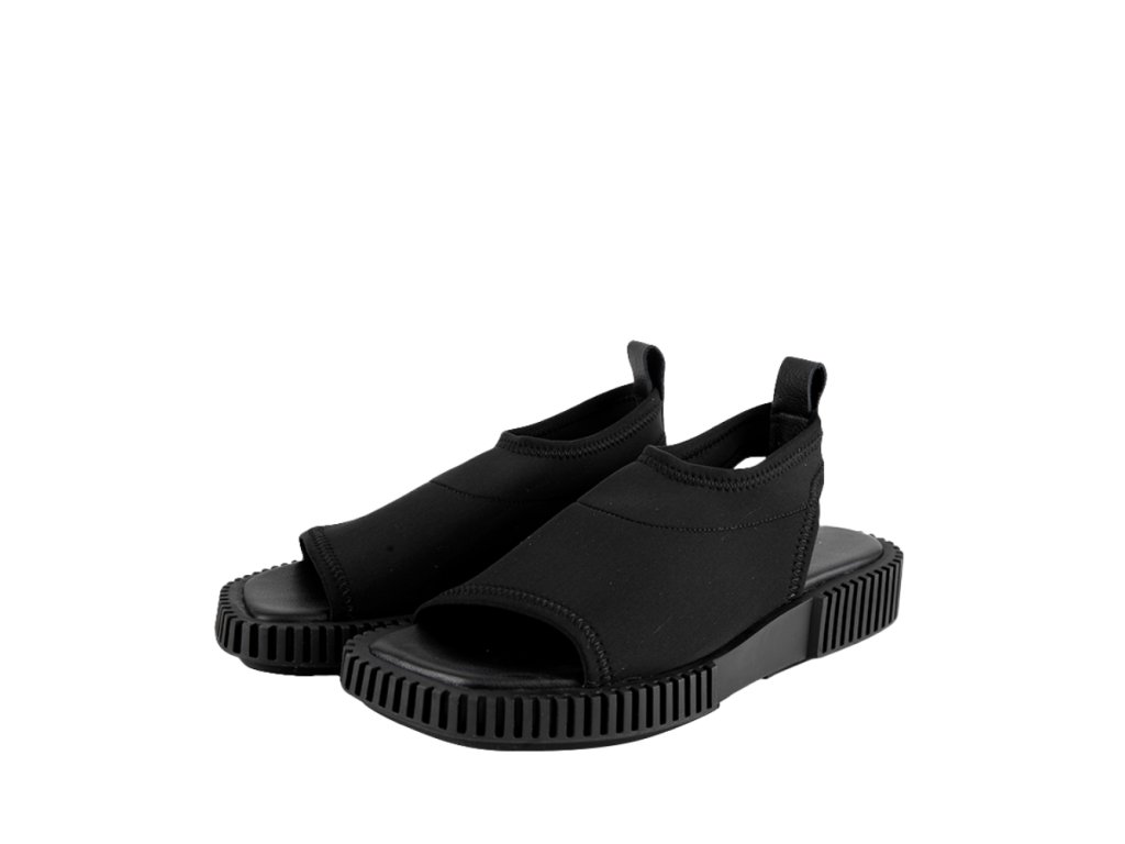 Nazouvací sandály s elastickým materiálem z pružné syntetické látky v černé barvě. Podešev z černé gumy nabízí lehkou a pohodlnou chůzi. Vnitřní stélka je hladká, černá a kožená, pro příjemný pocit při nošení.