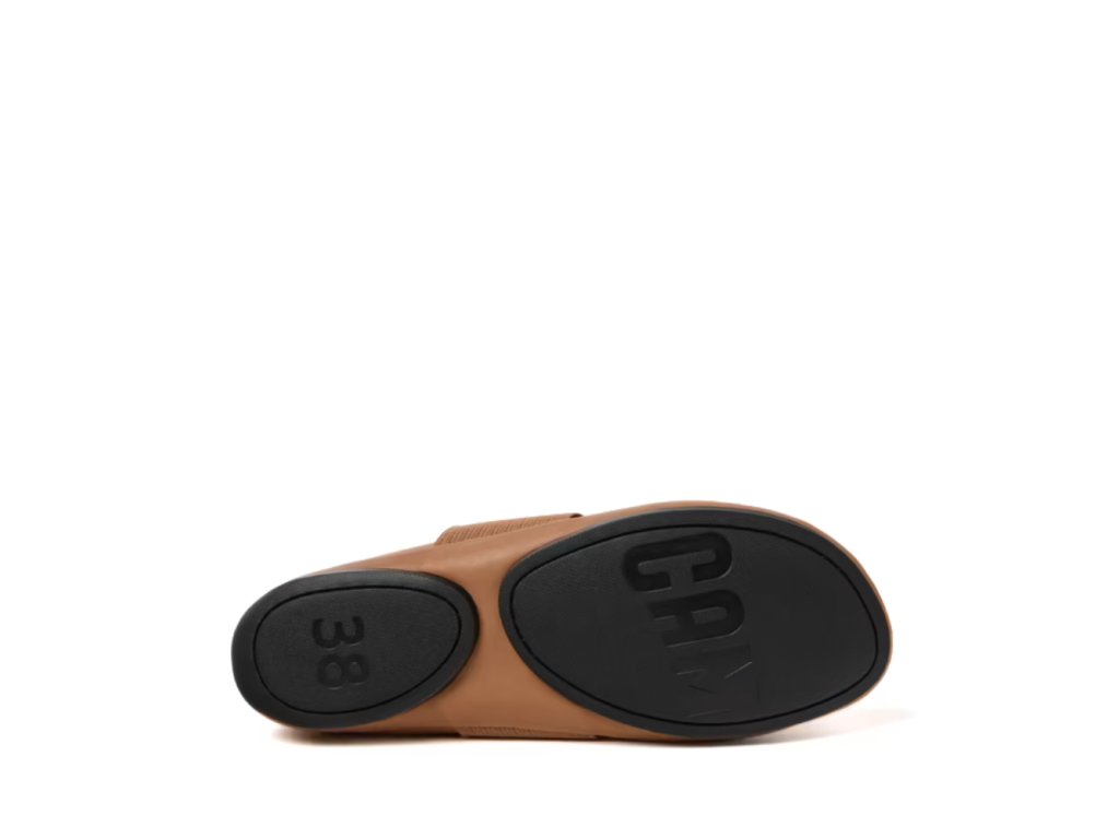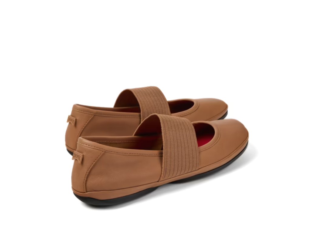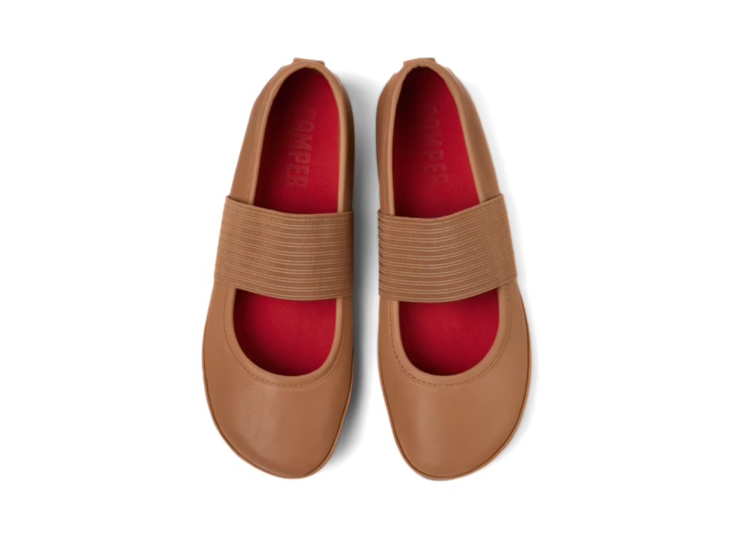 Dámské baleríny Camper Right Nina v moderním karamelovém odstínu kombinují eleganci a maximální pohodlí. Svršek z jemné kůže doplňuje široký elastický pásek přes nárt, který zajišťuje stabilitu a snadné obouvání. Charakteristická červená stélka z EVA pěny poskytuje měkké odpružení a komfort při každém kroku. Jednoduchý a nadčasový design je ideální pro každodenní nošení.