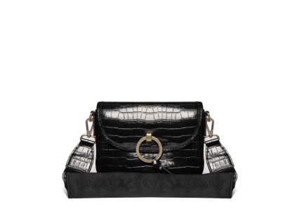 Stylová kabelka Bella černé barvy s krokodýlím vzorem, ozdobnou kovovou sponou a širokým nastavitelným popruhem. Praktická a elegantní volba pro každý den.