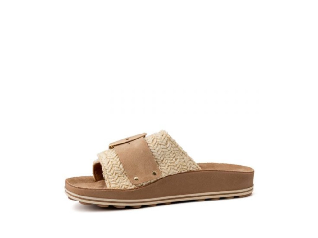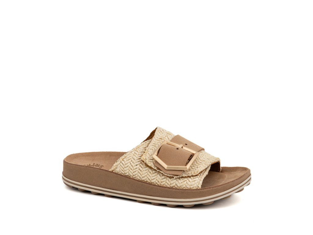 Stylové dámské pantofle s přírodním nádechem kombinují letní svěžest s vysokým komfortem. Široký nártový pásek s velkou sponou je nastavitelný pomocí suchého zipu, což zajišťuje individuální přizpůsobení každému chodidlu. Měkce polstrovaná stélka zaručuje pohodlí po celý den, zatímco tvarování podporuje správné držení nohy. Díky technologii Flexsole je podrážka extrémně lehká a flexibilní, což oceníte při každodenním nošení. Svršek z kombinace kůže a syntetiky přináší elegantní vzhled i praktickou odolnost. Vyrobeno v Řecku.