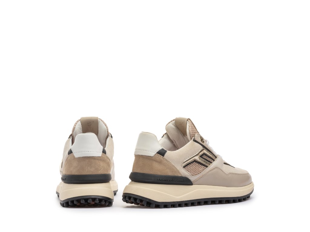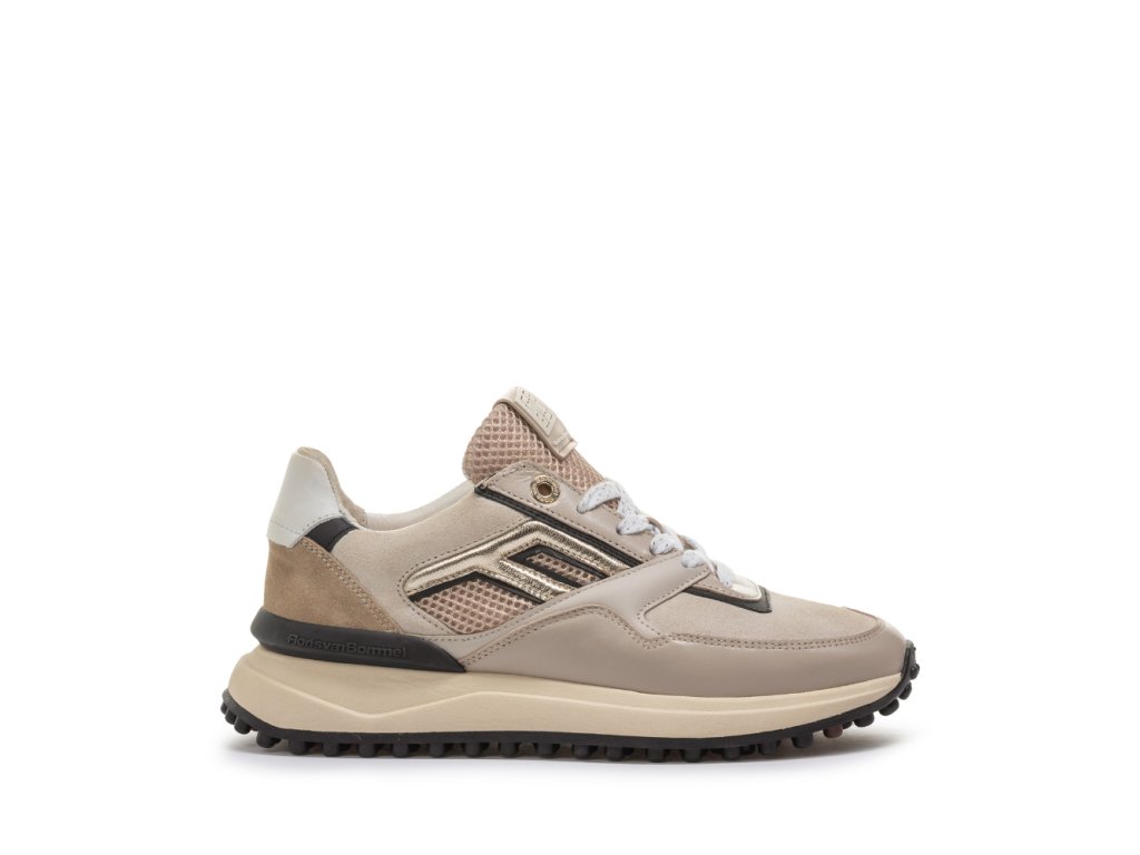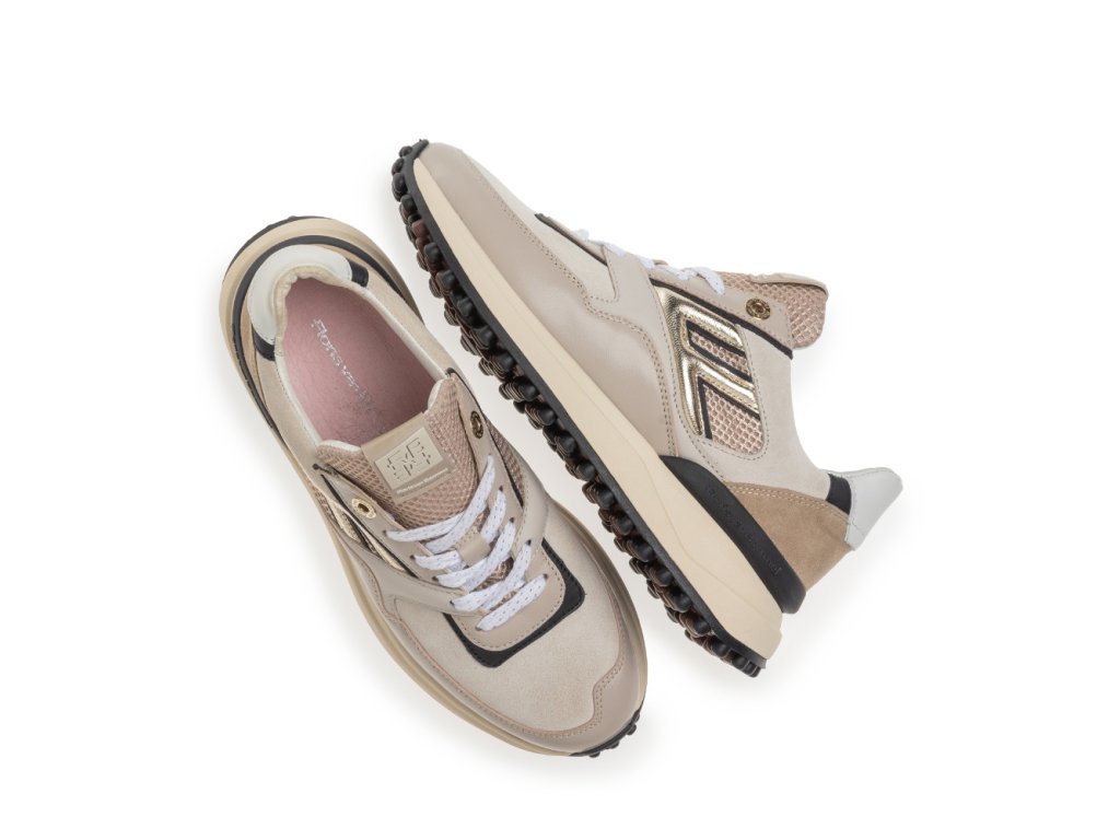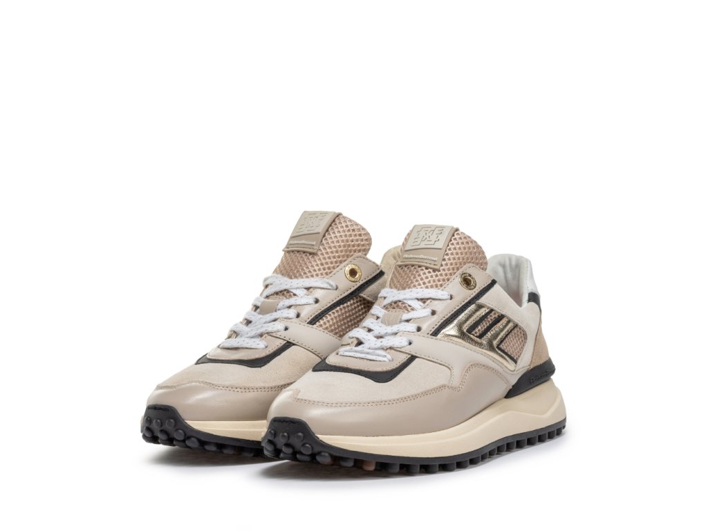 Vnitřní část tvoří kvalitní kožená podšívka a vyjímatelná stélka, které společně s pečlivě navrženým střihem zajišťují maximální pohodlí při nošení. Tento model je vyroben v luxusní kombinaci materiálů v odstínech šedé, béžové a zlaté – elegantní a přesto sportovní vzhled ideální pro každodenní využití.