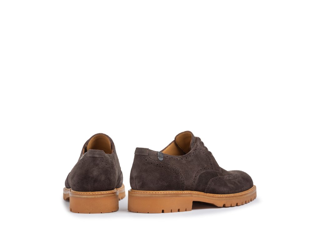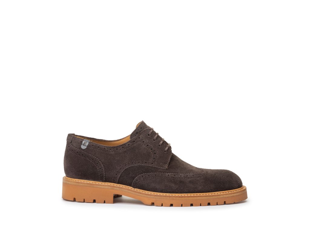 Obuv kombinuje mladistvý klasický vzhled s brogue detaily a maximálním pohodlím. Svršek je vyroben z italského semiše v odstínu čokolády s bohatou strukturou. Vnitřní podšívka je z měkké lýtkové kůže a celé kožené stélky jsou vyjímatelné, takže je lze snadno nahradit vlastní ortopedickou vložkou. Na patě je decentní kožený štítek s písmenem F jako jemný designový akcent. Tato obuv je ideální volbou pro každodenní eleganci s důrazem na pohodlí.