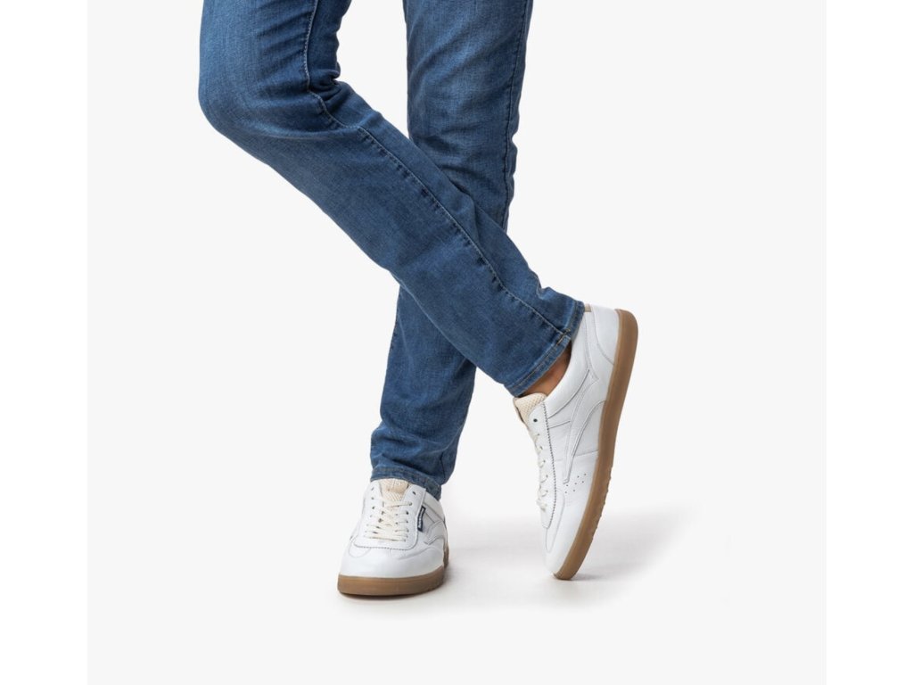 Svršek je vyroben z kvalitní bílé hladké kůže, doplněný o kontrastní krémový detail na patě a textilní jazyk ve stejné barvě. Na jazyku, boku i patě se nachází decentní loga značky. Vnitřek boty je vybaven luxusní koženou podšívkou a vyjímatelnou stélkou, kterou lze snadno vyměnit za vlastní ortopedickou vložku. Tyto tenisky kombinují nadčasový vzhled s maximálním pohodlím a jsou ideální volbou pro každodenní nošení.