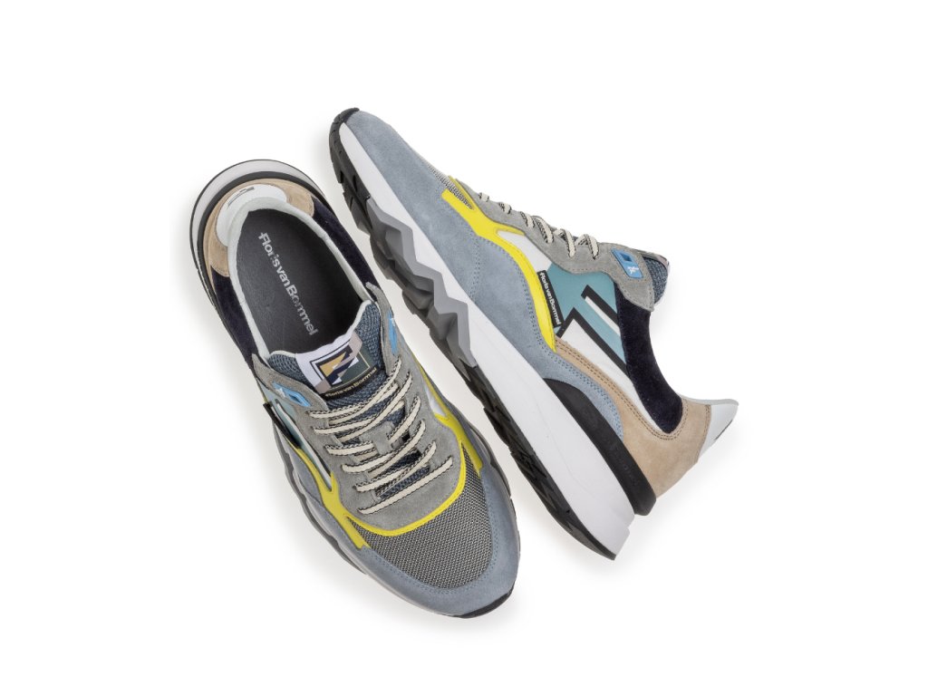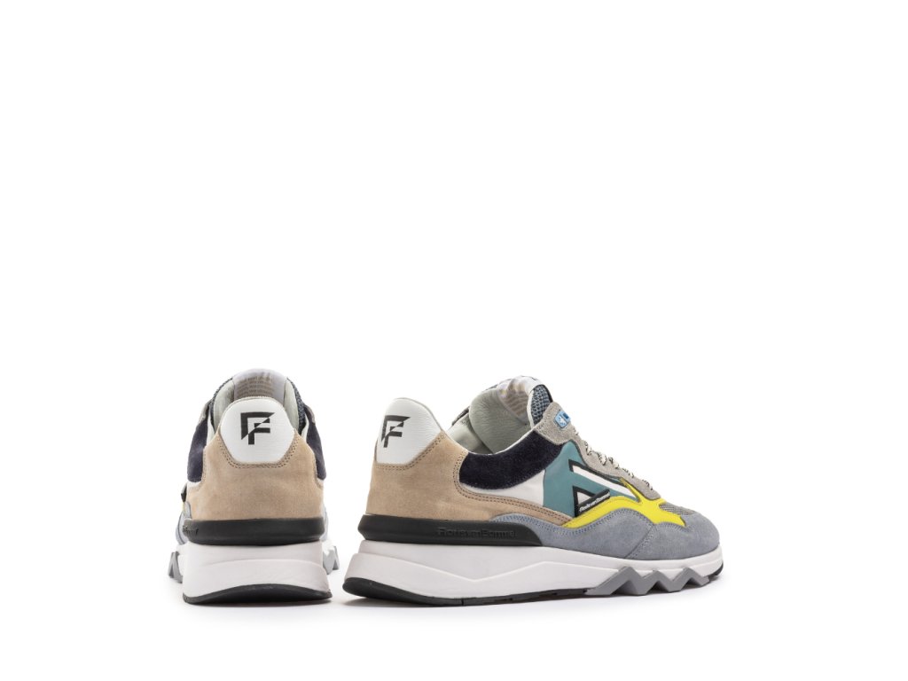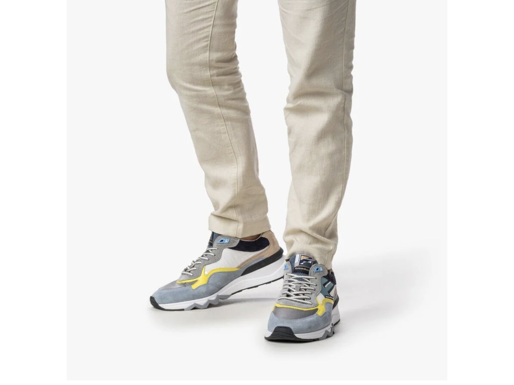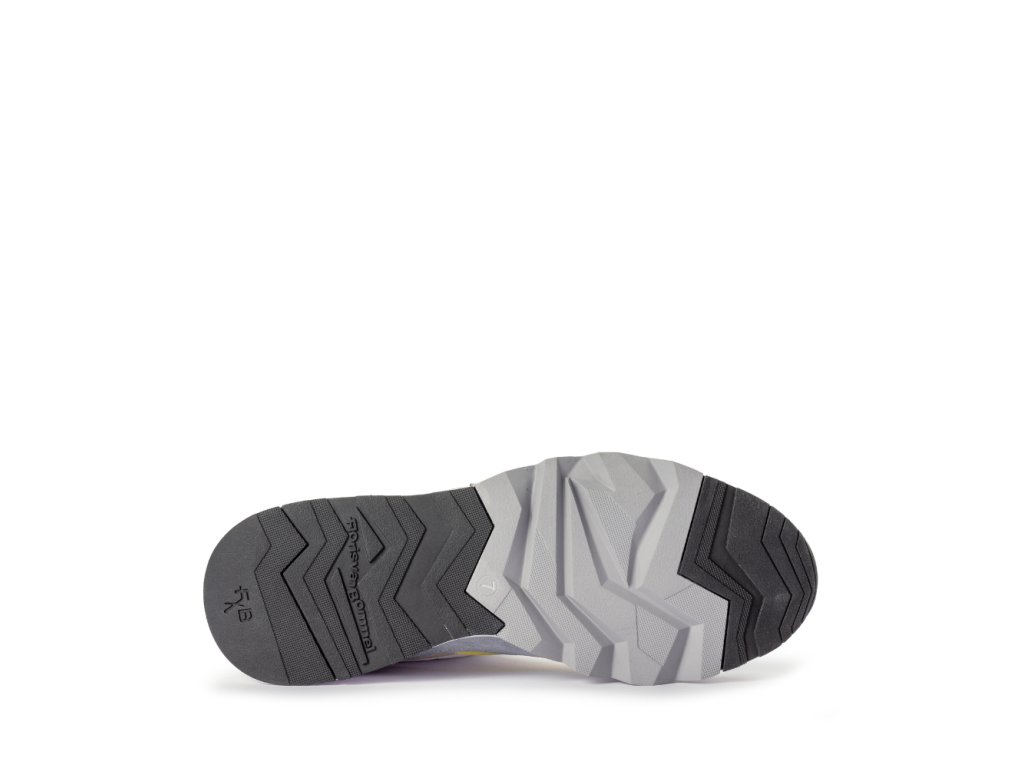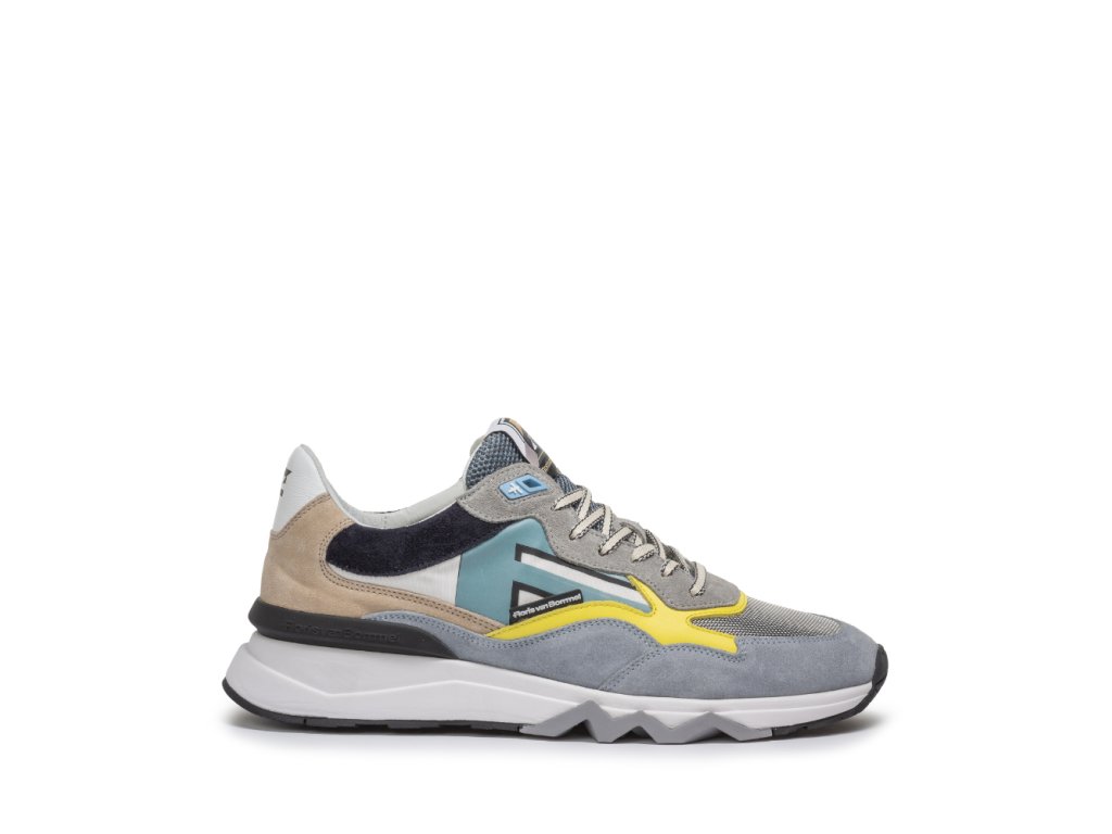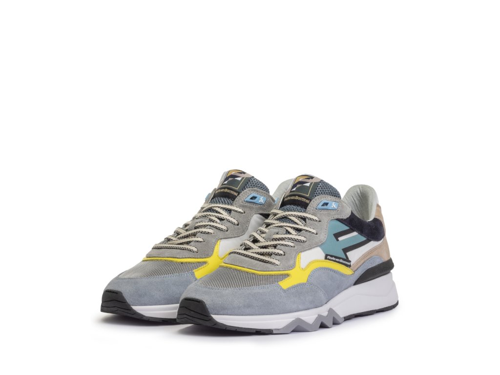 Tyto moderní tenisky zaujmou výraznou podrážkou, která má v oblasti paty vyšší objem a směrem k přední části se elegantně zužuje, čímž vytváří dynamický vzhled. Část podešve je vyrobena z extrémně lehkého EVA materiálu, zatímco zbytek podešve z TPU zaručuje dlouhou životnost a přilnavost. Typickým prvkem značky Floris van Bommel je šedá cik-cak linie na spodní části podrážky.