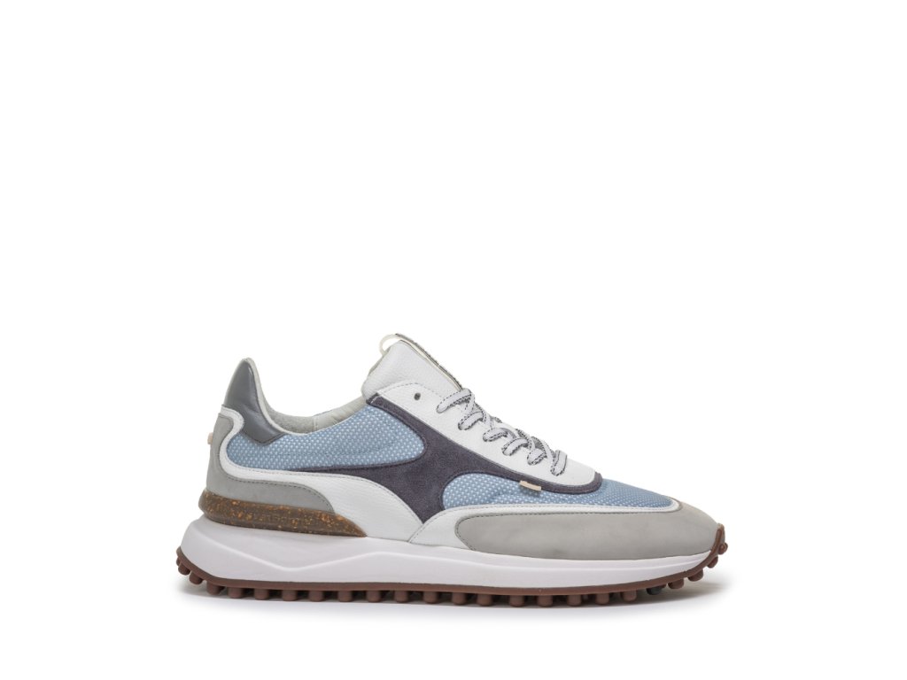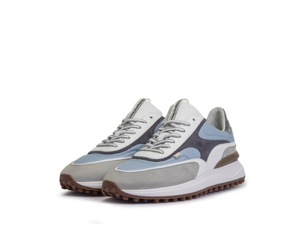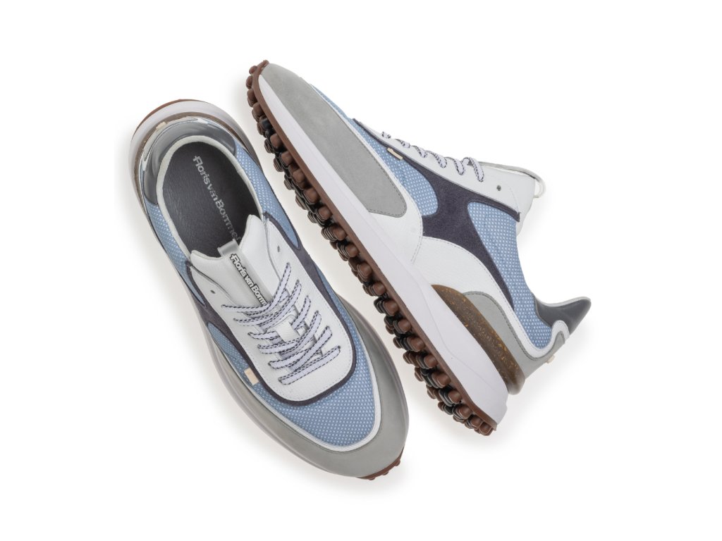 Model Noppi od značky Floris van Bommel představuje moderní a svěží pojetí klasické tenisky. Je vyroben z kombinace telecí kůže, síťoviny a prémiových materiálů v harmonických odstínech bílé, šedé a světle modré, které dodávají botě elegantní a zároveň sportovní charakter.