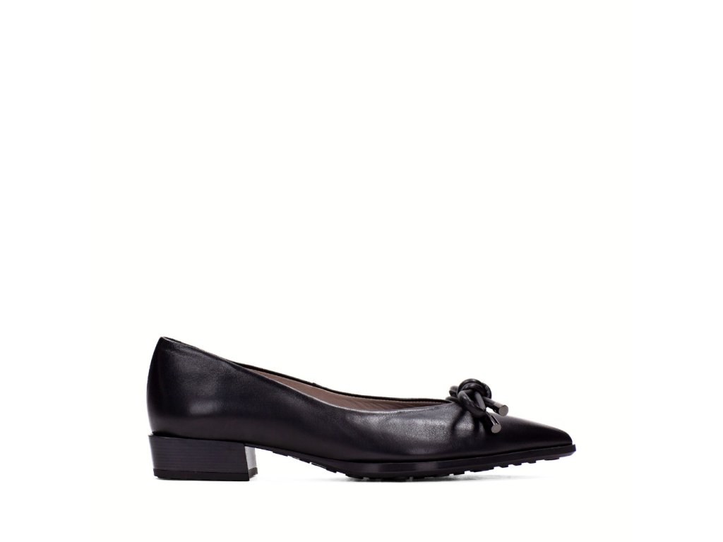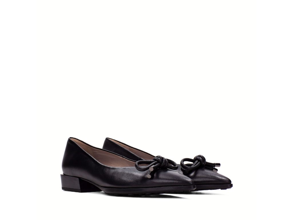 Stylové dámské baleríny, které spojují jednoduchou eleganci a komfort. Vyrobené z kvalitní hladké kůže v černém odstínu, doplněné ozdobnou tubusovou mašlí na nártu, která působí jemně a zároveň moderně. Špičatý střih špičky opticky prodlužuje chodidlo a dodává botám sofistikovaný charakter. Nízký podpatek o výšce 2,5 cm s gumovým efektem a jemným vzorkem na podešvi zajišťuje stabilitu a pohodlí při chůzi. Vnitřní kožená podšívka poskytuje příjemný pocit, zatímco technologie Triflow s trojitým polstrováním v oblasti došlapu účinně tlumí nárazy a přináší měkký a pružný krok. Perfektní volba pro ženy, které hledají univerzální baleríny s elegantním designem a maximálním pohodlím pro každý den.