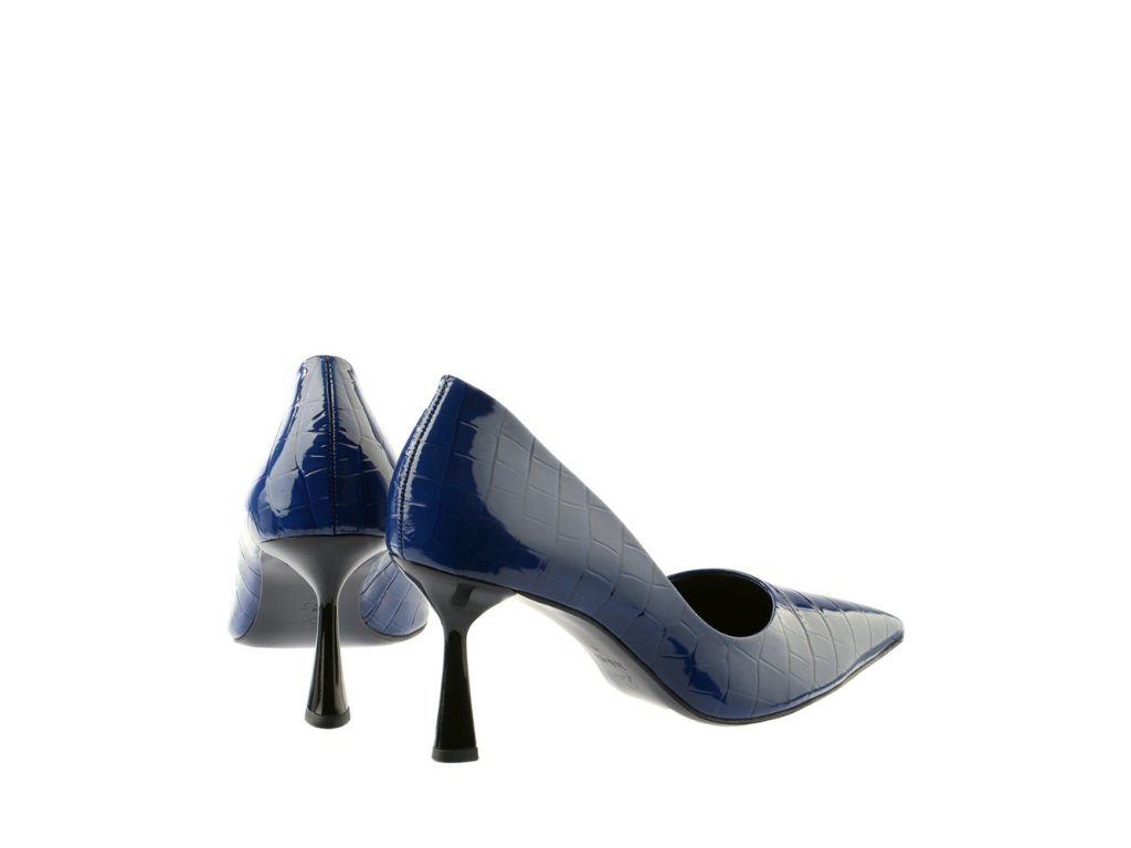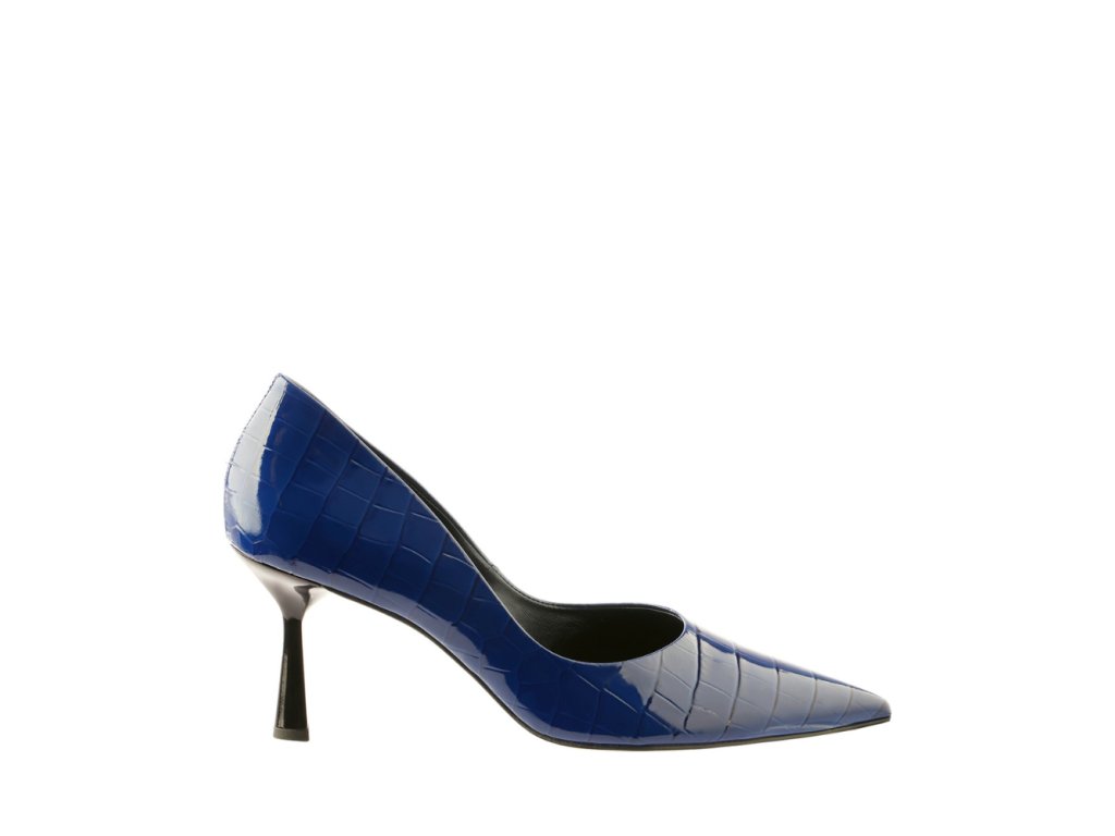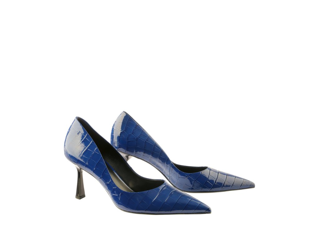 Dámské lodičky z lakované kůže v krokodýlím vzoru ztělesňují moderní eleganci s důrazem na detail a kvalitu. Intenzivní modrý odstín dodává botám osobitost a stává se výrazným doplňkem každého outfitu.