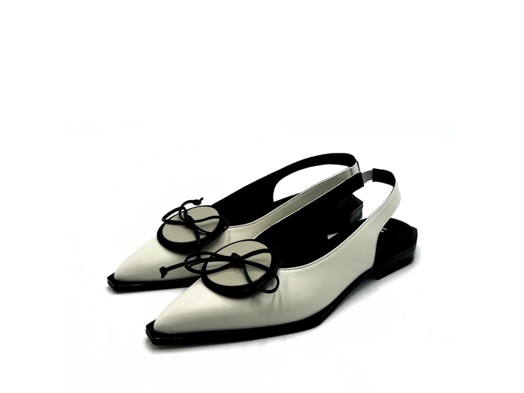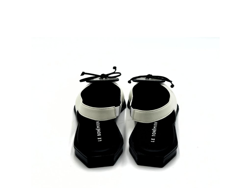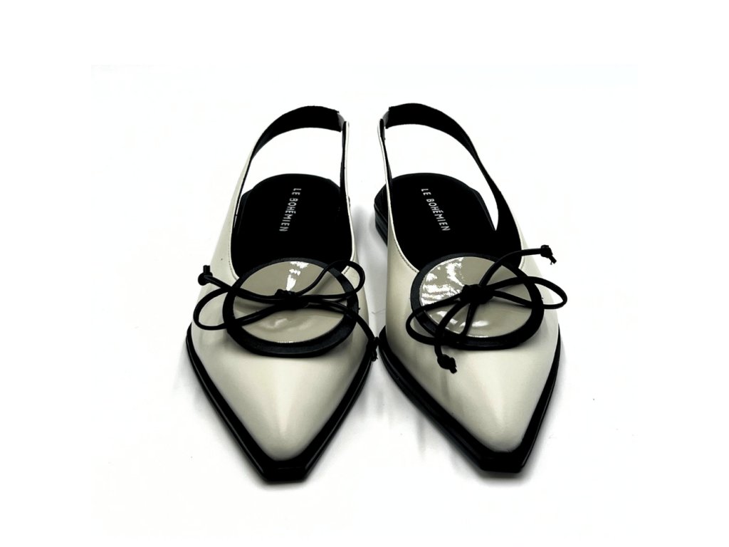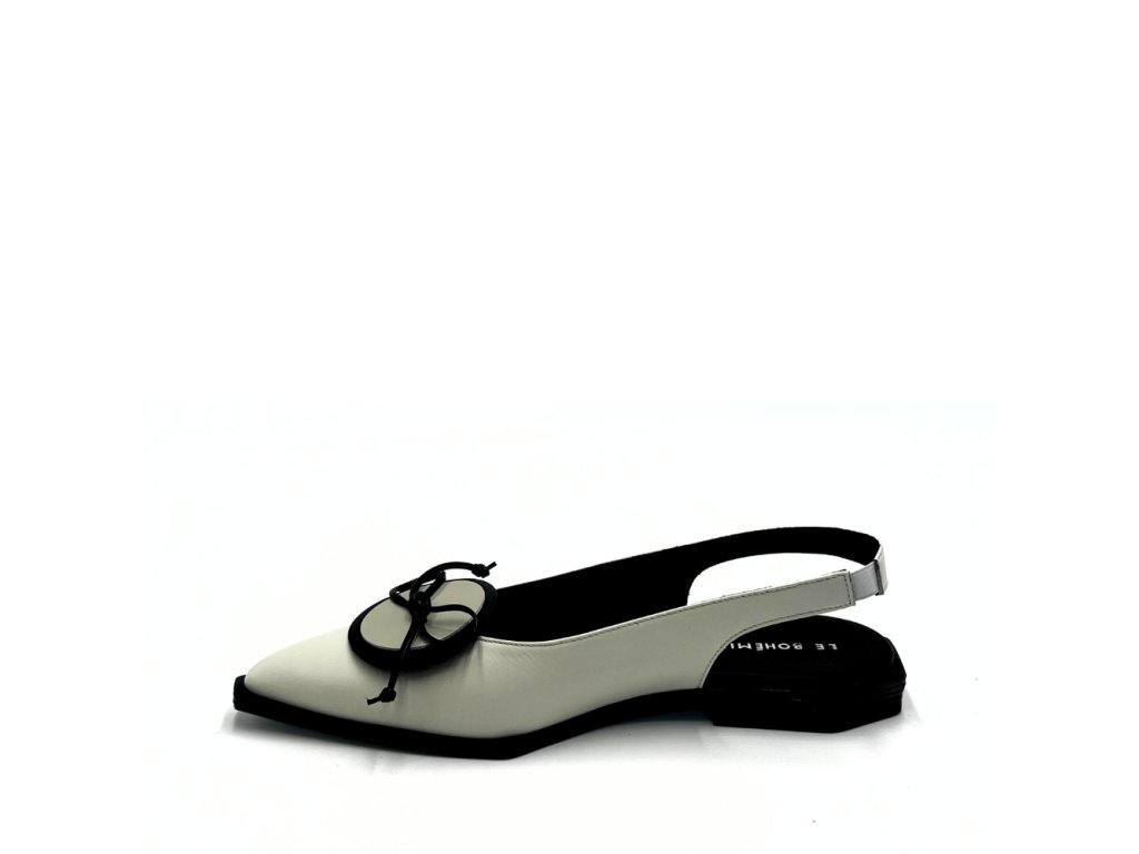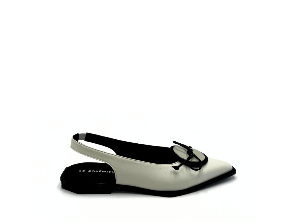 Dámské slingback baleríny Le Bohémien P14-3 VITELLO LATTE představují dokonalé spojení elegance, originality a italského luxusu. Tento model v krémově bílé barvě s kontrastní černou podrážkou zaujme svým čistým tvarem a jedinečným designovým detailem – ozdobou ve tvaru kruhu s jemnou mašličkou na nártu.