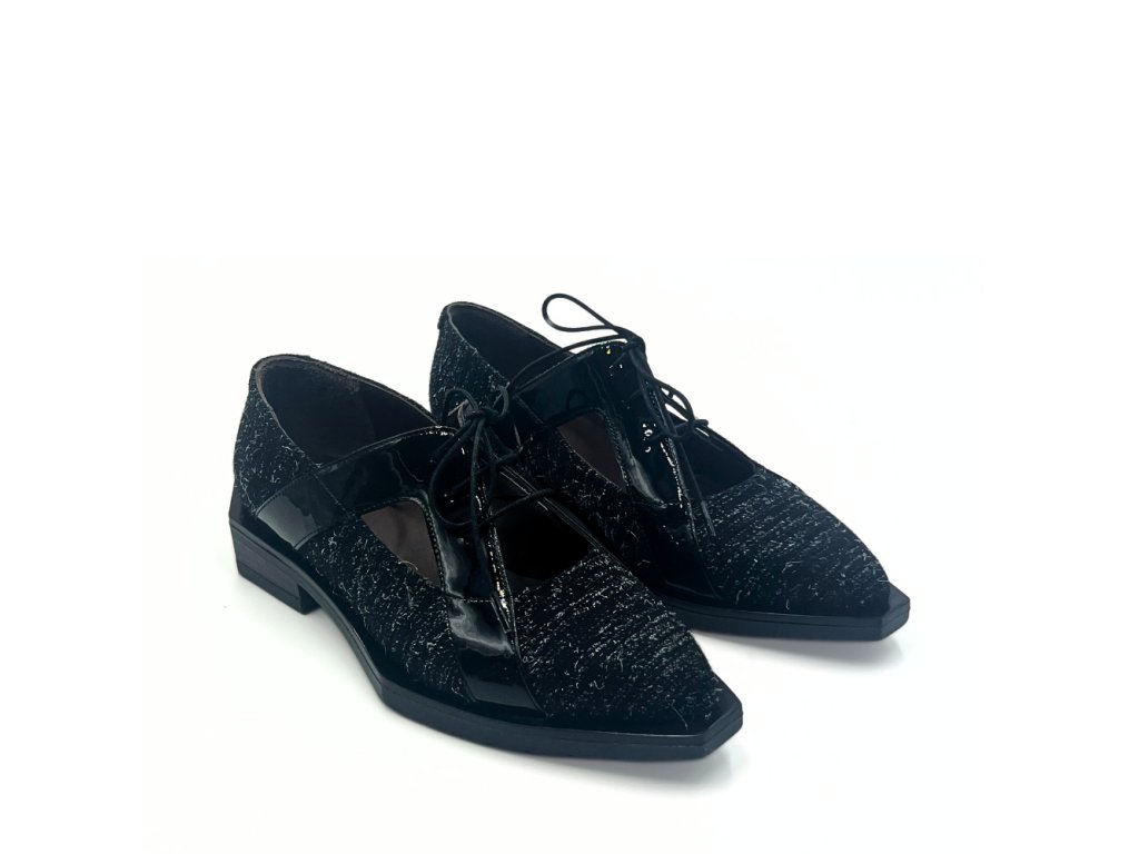 Tyto elegantní dámské polobotky od italské značky Le Bohemien jsou dokonalým spojením moderního designu, luxusních materiálů a precizního řemeslného zpracování. Svršek tvoří kombinace prvotřídní lakované kůže a vysoce kvalitní texturované látky, která přidává modelu unikátní hloubku a vizuální dynamiku.
