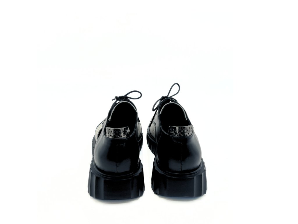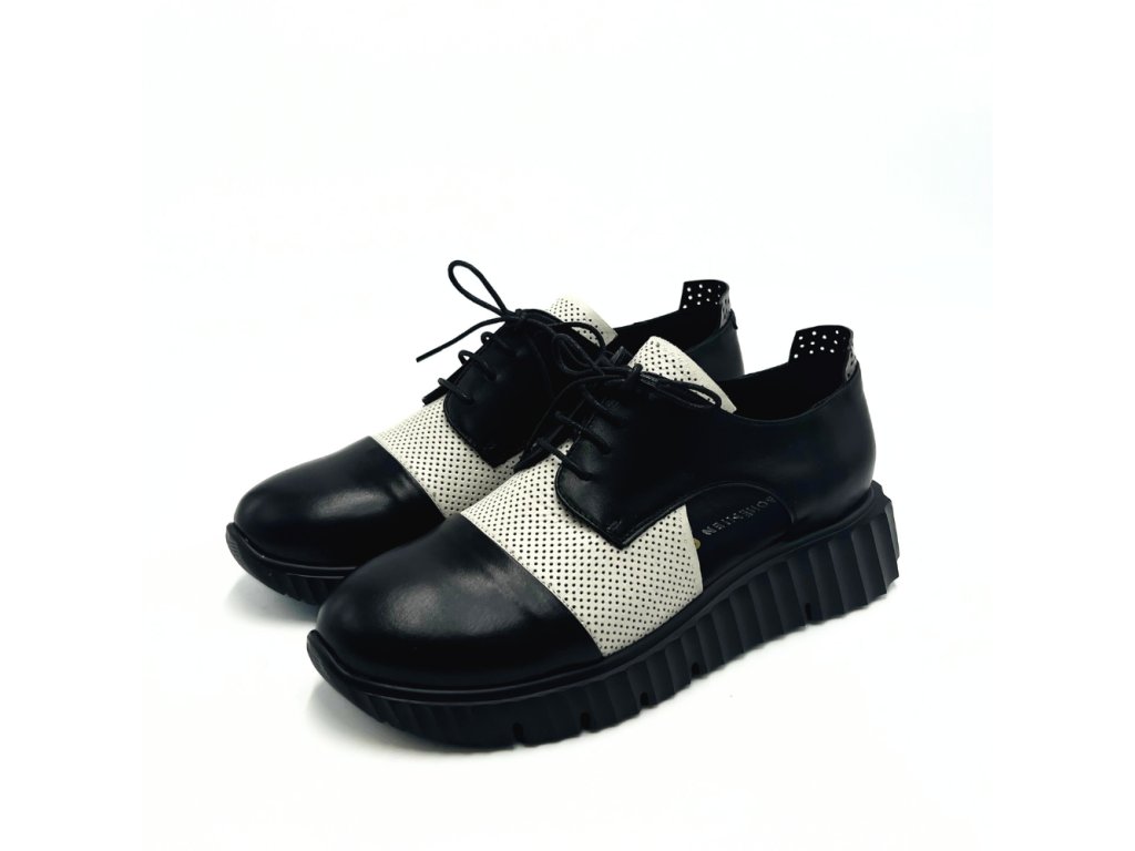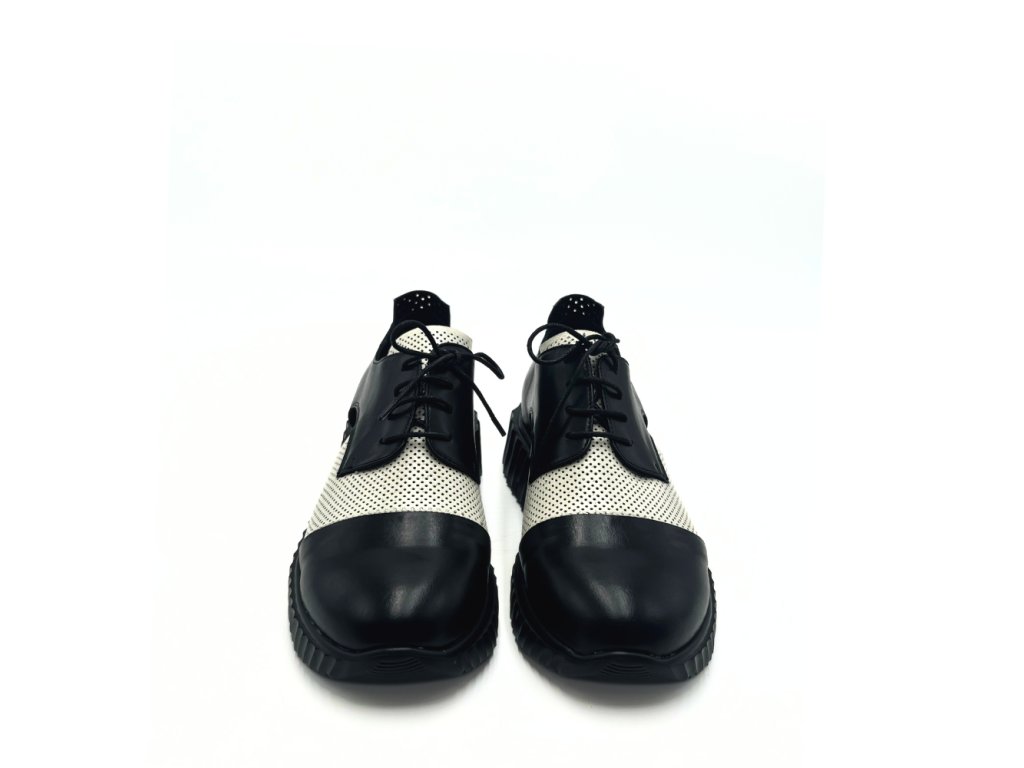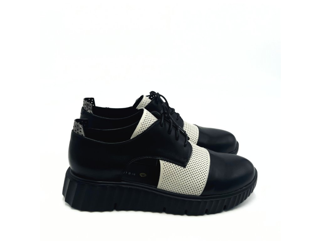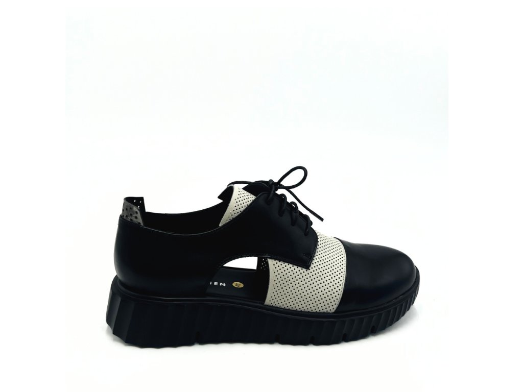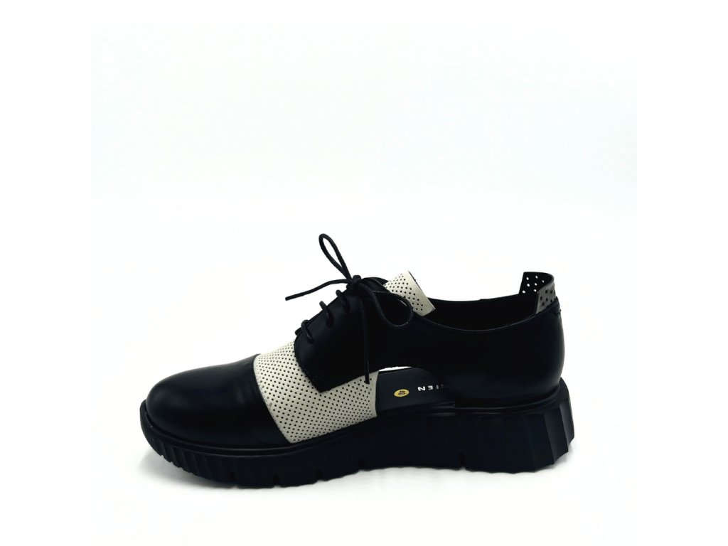 Model Le Bohémien SUN19-1 VITELLO NERO představuje sofistikovanou kombinaci klasického stylu a avantgardního designu. Tyto dámské polobotky zaujmou kontrastní hrou barev a materiálů – černá hladká kůže na špičce, patě a šněrovací části je doplněna bílou perforovanou kůží, která botám dodává jedinečný charakter.