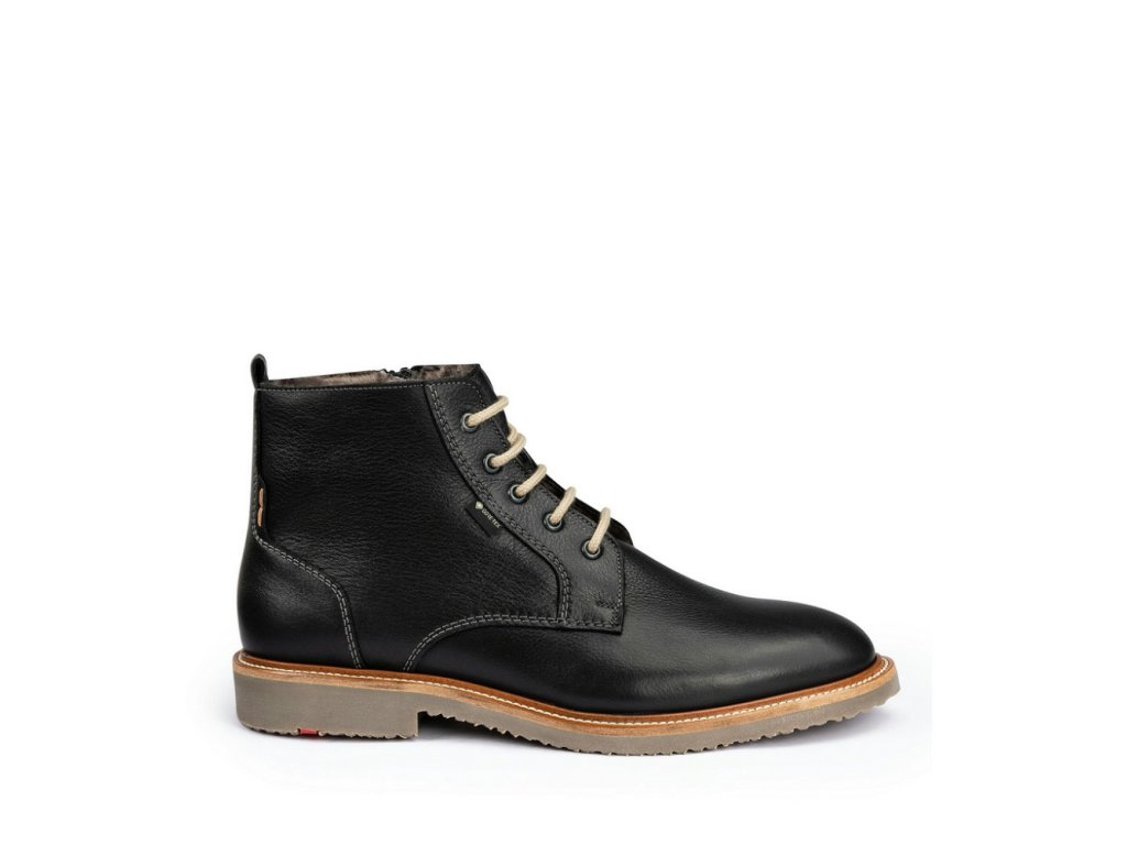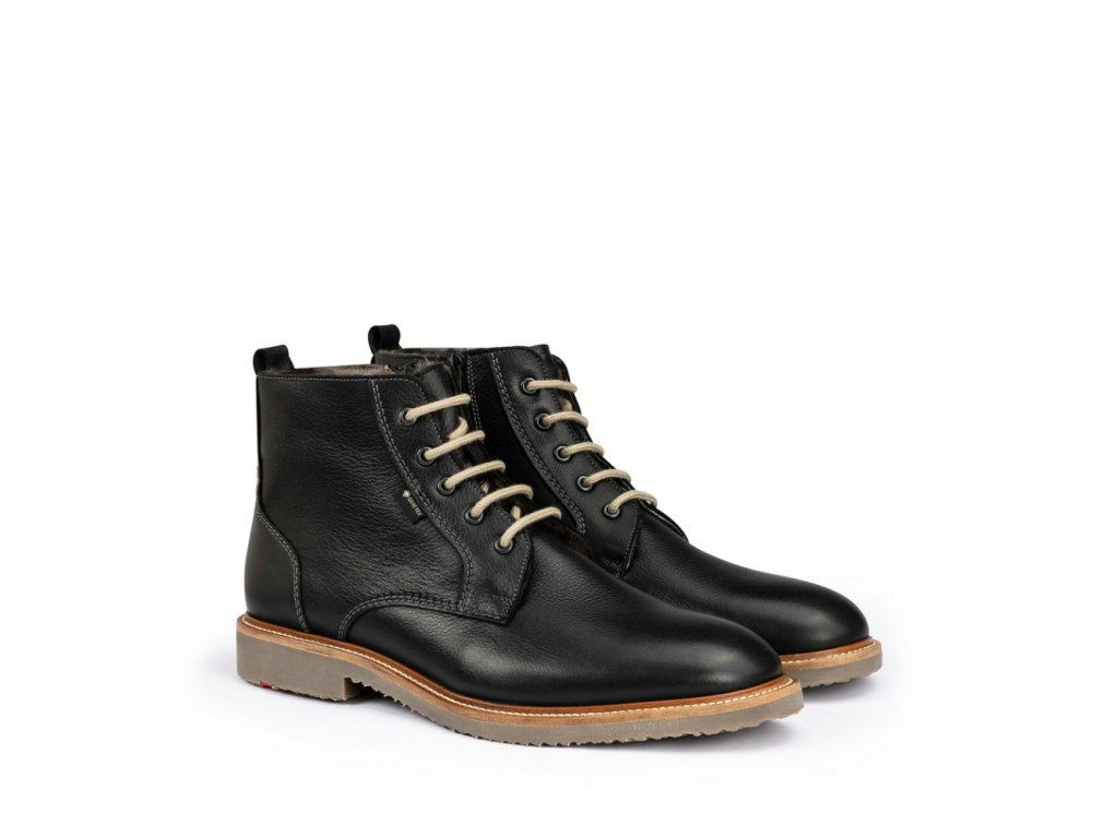 Kotníková obuv LLOYD z černé kůže zaujme trvale nepromokavou a prodyšnou membránou GORE-TEX, která zajišťuje pohodlí za každého počasí. Díky šněrování boty perfektně padnou a pevně drží na noze. Odolná gumová podešev výborně tlumí nárazy při chůzi, zatímco stélka z jehněčí kůže poskytuje teplý vnitřek. Nízký blokový podpatek zajišťuje stabilitu a pohodlí při každodenním nošení. Zip a odolný, zrnitý kožený svršek dotvářejí kvalitní a osobitý vzhled, zároveň usnadňují obouvání. Jehněčí podšívka udržuje nohy v teple i během chladných dnů a zároveň reguluje teplotu.
