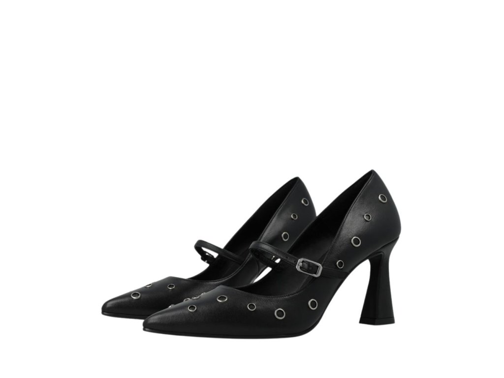 Model ROMINES od značky LODI přináší výrazné a stylové lodičky, které upoutají na první pohled. Elegantní černá kůže je ozdobena kovovými cvočky a doplněna nastavitelným páskem přes nárt pro dokonalé přizpůsobení. Špičatá špička a zakulacený výstřih boty zvýrazňují ženskost, zatímco 8 cm vysoký geometrický podpatek dodává celému modelu moderní šmrnc. Uvnitř je kožená podšívka a měkká gelová stélka, která zajistí maximální pohodlí při každém kroku. Vyrobeno s precizností ve Španělsku.
