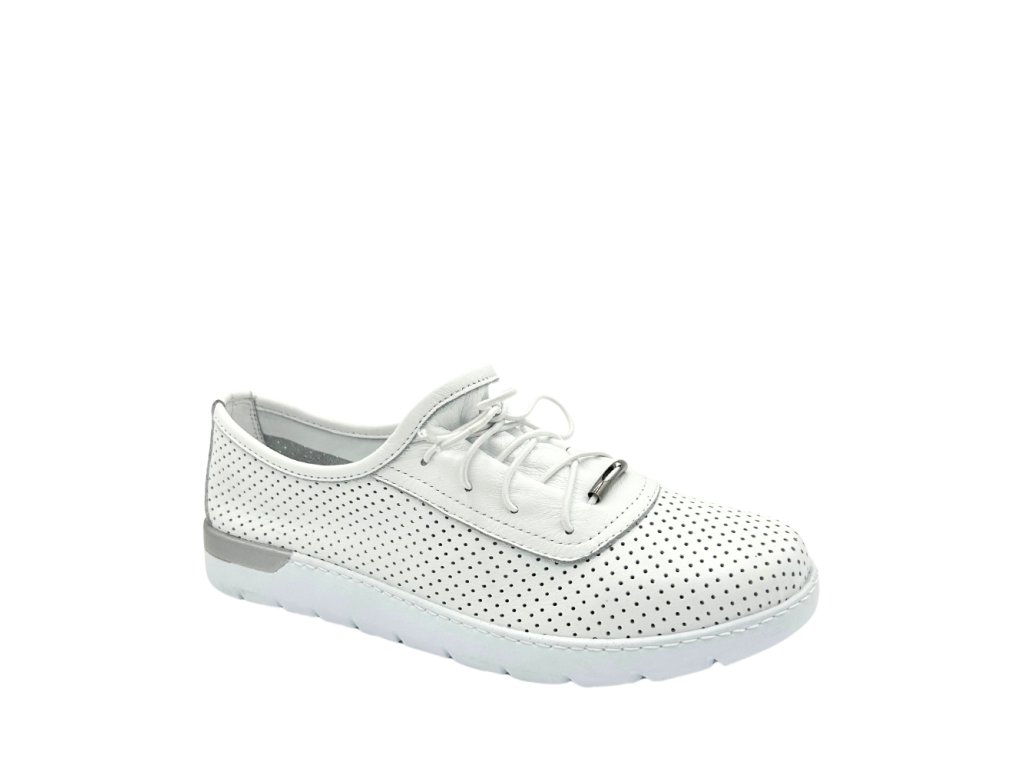 Vzdušné kožené tenisky s děrovaným svrškem, které budou na letní a jarní procházky číslem jedna. Nechte svá chodidla dýchat, dopřejte jim lehkost a měkčenou stélku Looke. Bílá barva se hodí ke každé slunné kombinaci. Tkaničky jsou elastické a zakončené stříbrným válečkem, doplňující stříbrný pruh na patě. Svršek je specifický svým propojením jazyk se zbylou částí obuvi do jednoho dílce - nemají klasický jazyk. Díky bezešvému prostoru v oblasti palce jsou vhodnou volbou i pro hallux.