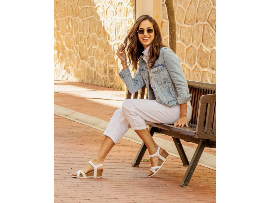 Dámské sandály na klínku z bílé napa kůže kombinují stylový vzhled s pohodlím a kvalitou. Bílý elegantní design je univerzální a snadno doplní jak letní šaty, tak i volnočasové outfity. Klínový podpatek o výšce 6,5 cm poskytuje decentní zvýšení postavy a zároveň stabilní došlap.
