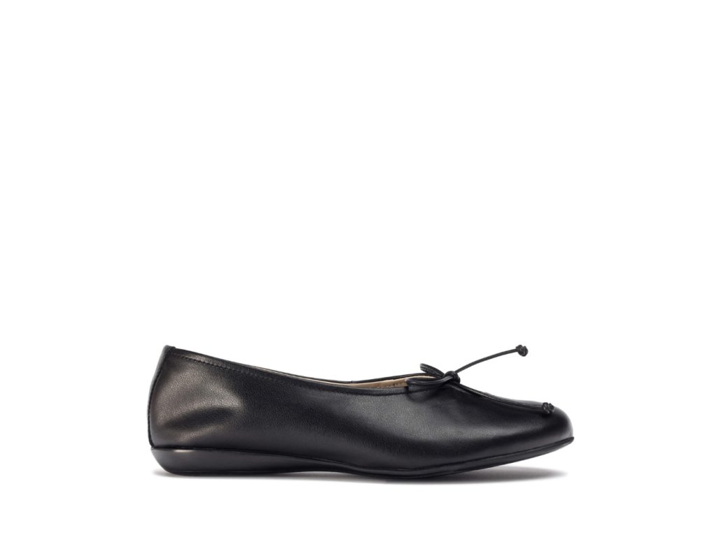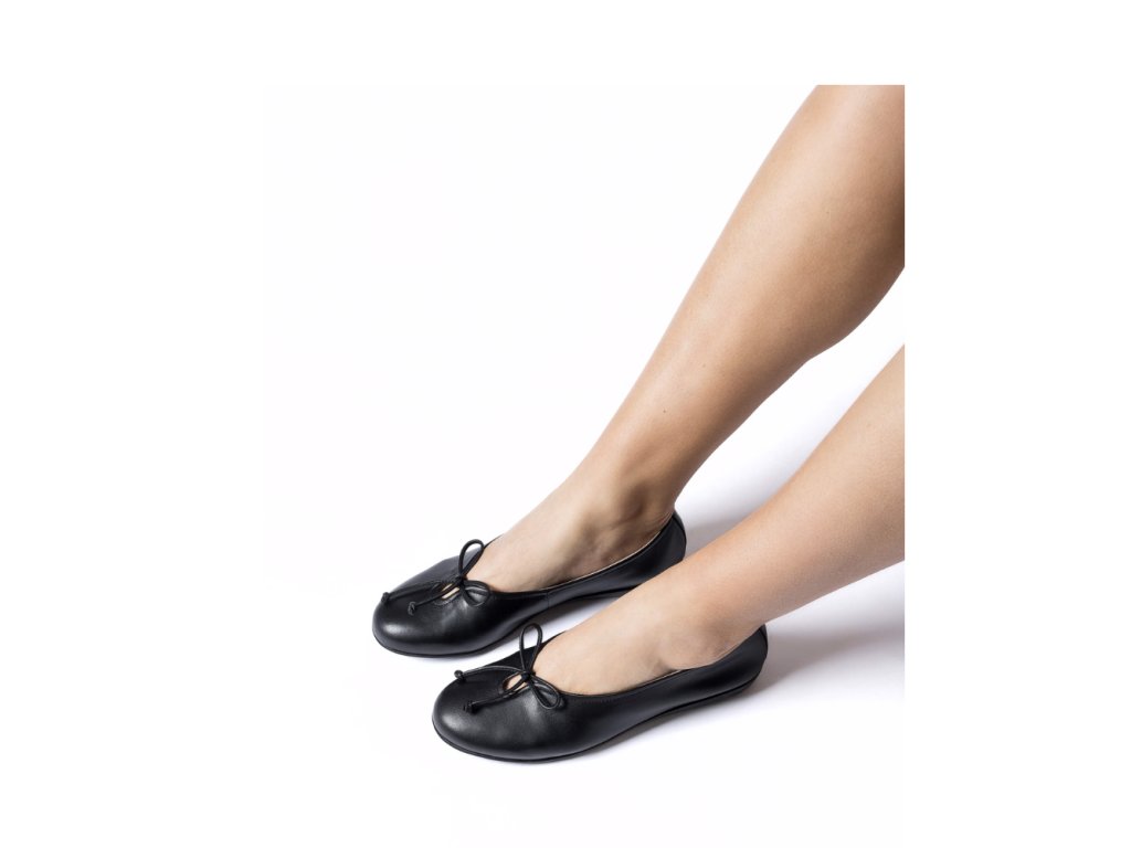 Ploché baleríny CELESTINA, vyrobené z hladké černé kůže. Tento jednoduchý design s kulatou špičkou a výřezem do oblouku je doplněn ozdobnou mašličkou. Stélka MemoryGel poskytuje maximální pohodlí a tlumí každý krok. #MadeWithLoveInSpain.