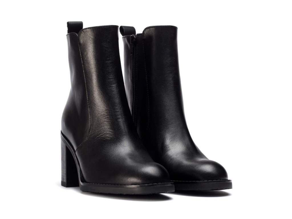 Svršek je vyroben z kvalitní hladké kůže, která působí luxusně a zároveň zajišťuje dlouhou životnost. Kotníkový střih poskytuje stabilní oporu, zatímco boční zip usnadňuje rychlé a pohodlné obouvání. Vysoký podpatek opticky prodlužuje nohy, aniž by ubíral na komfortu.