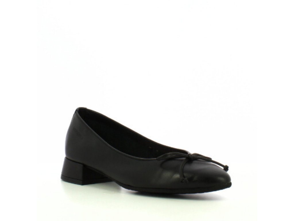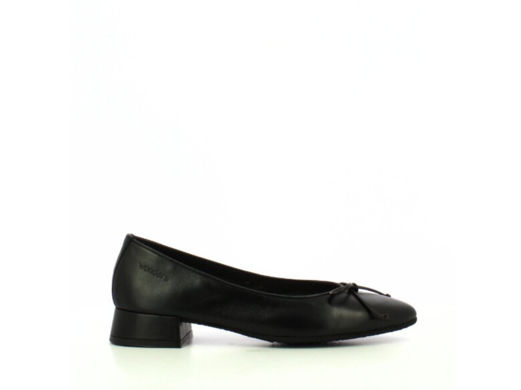 Lodičky ve stylu balerín DARI s podpatkem, vyrobené z hladké kůže v černé barvě. Tento klasický, nepodšitý model nabízí zvýšené pohodlí, ideální pro celodenní nošení. Má špičatou špičku a ozdobný uzel na nártu. Nízký hranatý podpatek, potažený stejným materiálem, zajišťuje stabilitu. Ohebná gumová podrážka a stélka MemoryGelzaručují maximální komfort. Značka Wonders podporuje udržitelnou výrobu certifikovanou organizací LEATHERWORKING GROUP.
