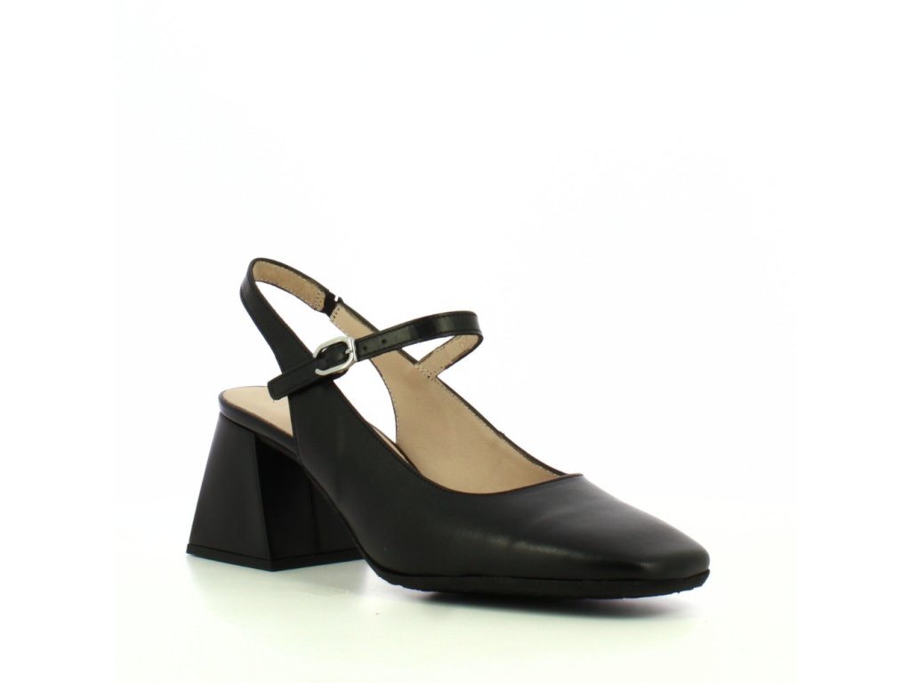 Lodičky JANE typu slingback, vyrobené z jemné černé kůže. Tento univerzální a stylový model má čtvercovou špičku a nastavitelné pásky: jeden se sponou přes nárt a druhý elastický pásek kolem paty pro bezpečné upevnění. Široký potažený podpatek zajišťuje stabilitu, zatímco pružná gumová podrážka a stélka s technologií MemoryGel poskytují maximální pohodlí po celý den. Značka Wonders podporuje udržitelnou výrobu s certifikací LEATHERWORKINGGROUP.