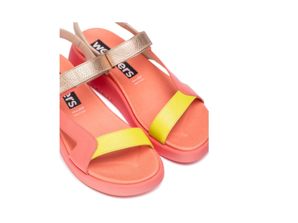 Ploché sandály HALI vyrobené z kombinace korálové, žluté a zlaté kůže. Tento univerzální model má pásek přes nárt a zadní pásek, oba opatřené zapínáním na suchý zip pro bezpečné uchycení. Technologie WondersFly™ zajišťuje lehkost a flexibilitu, zatímco stélka MemoryGel nabízí výjimečné pohodlí. Připravte se na jedinečný pocit #YesWeFly.