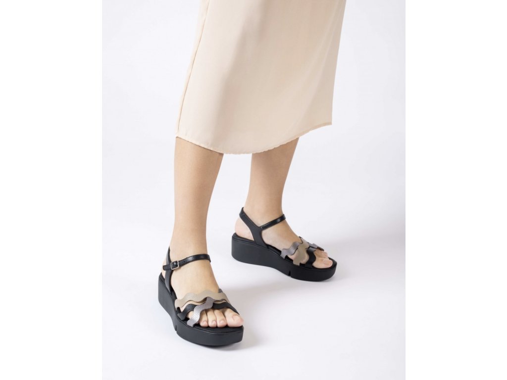 WONDERS sandály na platformě černé kožené | B-7943 PLOMO NEGRO TAUPE