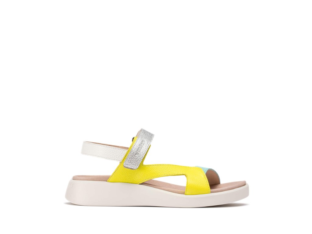 Ploché sandály HALI vyrobené z kombinace světle modré, žluté a stříbrné kůže. Tento univerzální model má pásek přes nárt a zadní pásek, oba opatřené zapínáním na suchý zip pro bezpečné uchycení. Technologie WondersFly™ zajišťuje lehkost a flexibilitu, zatímco stélka MemoryGel nabízí výjimečné pohodlí. Připravte se na jedinečný pocit #YesWeFly.